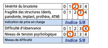 Prise en charge cognitivo-comportementale (PECC) avec forte motivation initiale le patient n’étant pas du tout conscient du bruxisme et probablement peu compliant.