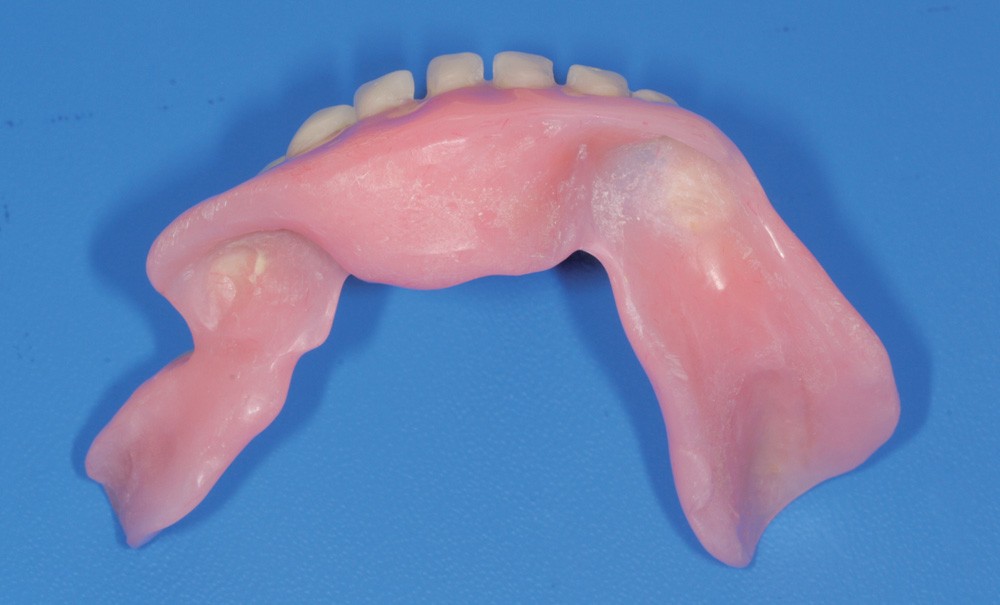 La décision thérapeutique retenue consiste en la réalisation de deux prothèses amovibles complètes de transition, choix tenant compte de la situation clinique : l’anatomie particulière de l’arcade mandibulaire, et le fait que le patient n’a jamais porté de prothèse et n’est pas prêt psychologiquement à en recevoir.