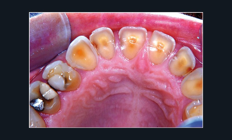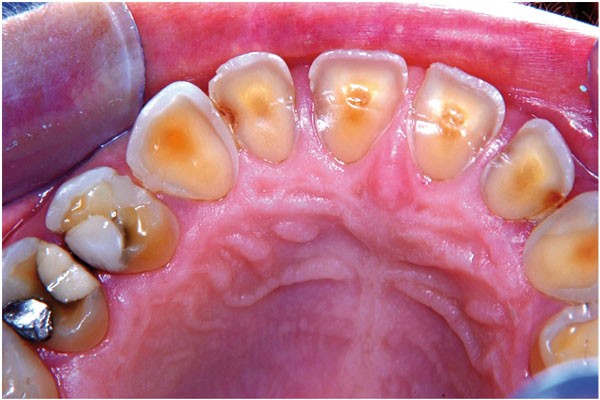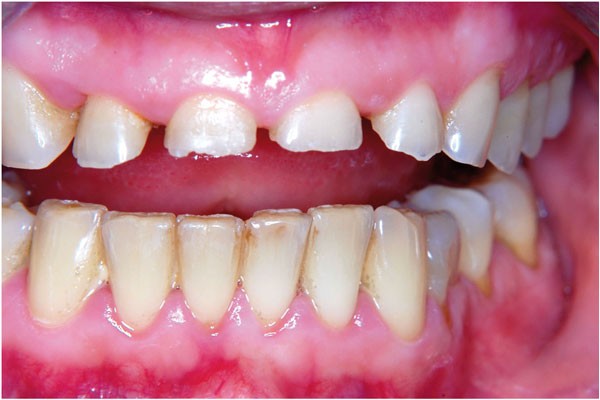 L’examen clinique est conduit par le praticien qui prend quelques photos : de face (fig. 1), en vue occlusale maxillaire (fig. 2) et en occlusion (fig. 3).