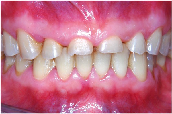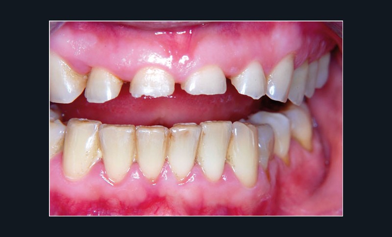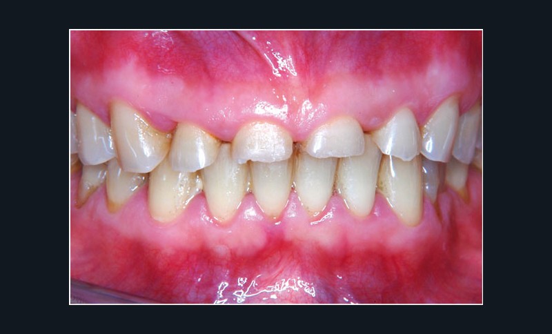 Madame R, 38 ans, se présente en consultation pour un sourire qu’elle trouve disgracieux, des sensibilités dentaires et une difficulté à s’alimenter en raison de bourrages alimentaires.