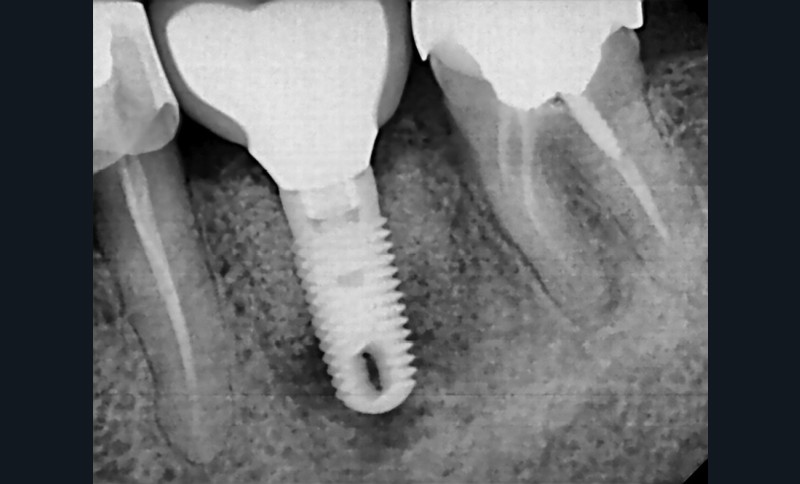 D’après la récente classification de Chicago (2017) des maladies parodontales et péri-implantaires, la péri-implantite est définie comme une pathologie induite par un biofilm dysbiotique, et caractérisée par une inflammation de la muqueuse péri-implantaire et par une perte progressive du support osseux. C’est donc un processus inflammatoire le plus souvent lent et irréversible qui atteint les tissus mous et durs péri-implantaires [3]. L’étude menée par Mombelli et coll. en 2012 montre que 20 % des patients chez qui il a été posé des implants et 10 % des implants posés déclareront une péri-implantite dans les cinq à dix ans après la pose (fig. 2) [4].