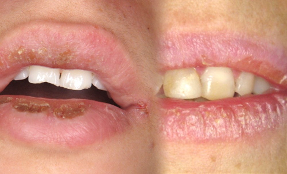 Histoire de la maladie. La patiente décrivait la présence régulière de « croûtes » brunâtres sur le bord vermillon des lèvres. Elle avait consulté son médecin généraliste qui lui avait prescrit des émollients et des antifongiques locaux, sans effet.