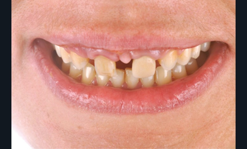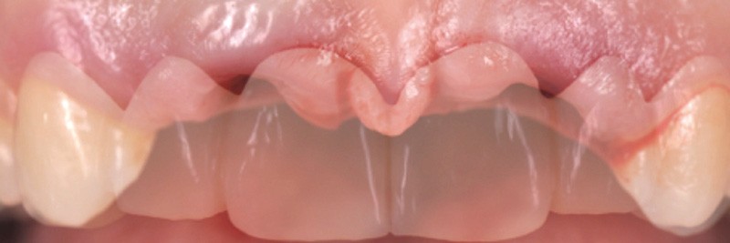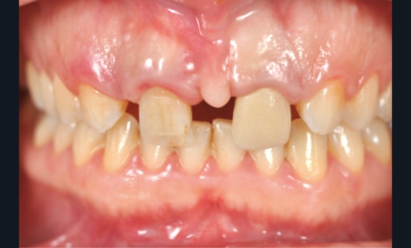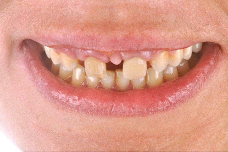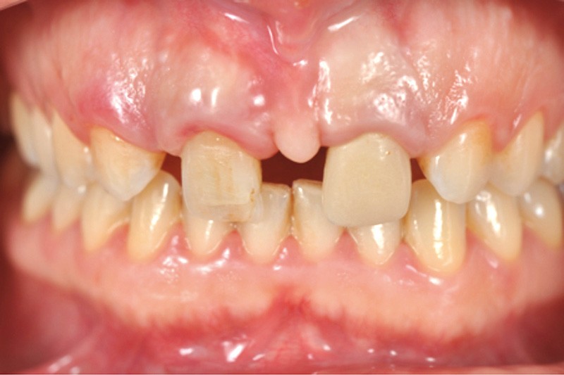 Une patiente de 32 ans se présente à la consultation pour une réhabilitation de son sourire qu’elle trouve disgracieux. L’examen clinique révèle en effet l’absence des deux incisives latérales maxillaires à la suite d’un accident survenu à l’adolescence, ainsi que la présence des deux incisives centrales (11 et 21) à mi-chemin entre la position idéale et les incisives latérales à la suite d’un traitement orthodontique ayant pris l’option de cette position intermédiaire.