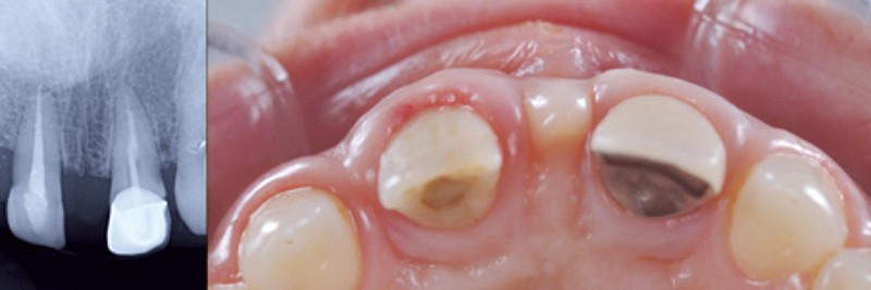 De plus 11 et 21 ont subi des traitements endodontiques et la 21 est coiffée. Des reconstitutions corono-radiculaires de nature différente sont notées sur 11 et 21. L’examen radiologique fait aussi ressortir une perte osseuse d’environ 30 %, qui explique les mobilités cliniques dont se plaint la patiente. Enfin, la 11 présente de manière récurrente des épisodes infectieux avec une inflammation chronique de la gencive.