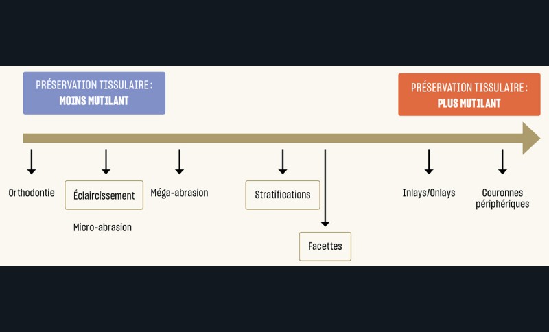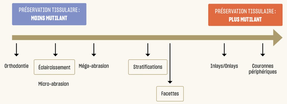 Face à la demande esthétique croissante des patients en quête d’un sourire attractif – synonyme d’une bonne intégration psychosociale –, la réflexion du praticien doit se faire dans l’optique d’une préservation tissulaire maximale, en proposant les thérapeutiques les moins mutilantes, dans le cadre du respect du gradient thérapeutique décrit par Tirlet et Attal [2] (fig. 1).