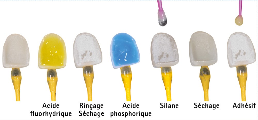 Un traitement à l’acide fluorhydrique à 5 % pendant 20 secondes est réalisé. Après rinçage abondant à l’eau, une couche de silane est appliquée sur la surface mordancée [17].