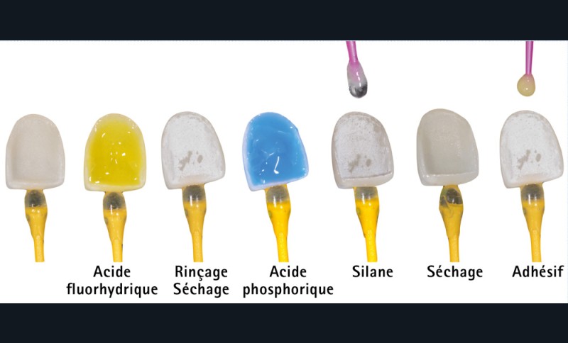 Cette étape, réalisée par le praticien après essayage de la pièce prothétique, est parfois effectuée par le prothésiste. Dans ce cas, après l’étape d’essayage, la restauration ayant été contaminée par la salive, le praticien se contentera de réactiver la surface par l’application d’acide phosphorique à 35-37 % pendant 15 secondes [5].