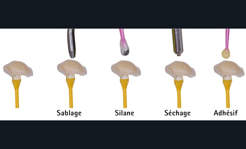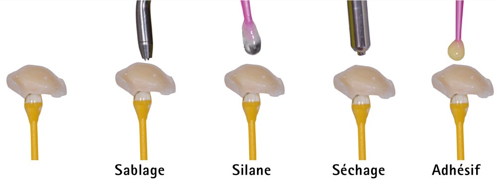 Un sablage à l’oxyde d’aluminium 27 µm doit être fait, suivi d’un nettoyage de la surface par application d’acide phosphorique à 37 % pendant 60 secondes. Après rinçage à l’eau puis séchage, une couche de silane est appliquée [17]. L’utilisation de cette composante chimique est aujourd’hui controversée.