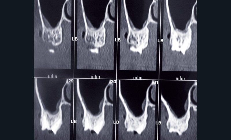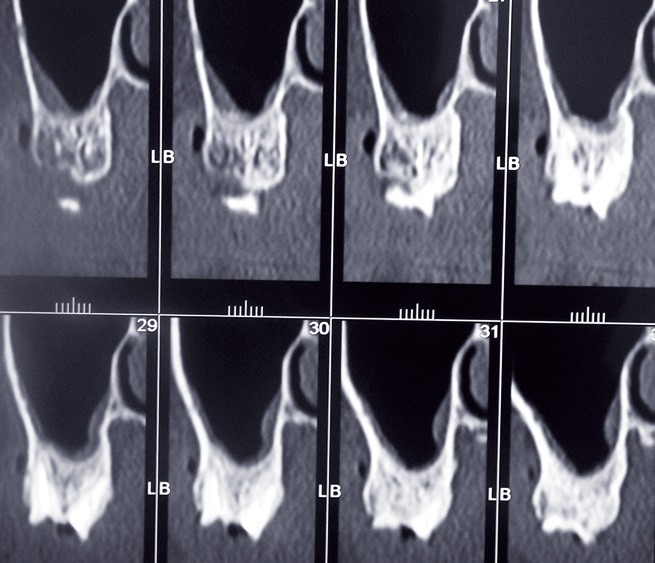 Tout d’abord je décris l’intervention : après ouverture d’un volet osseux par abord latéral à l’aide d’un instrument de piézochirurgie, je dépose dans un godet avec du sérum physiologique le volet osseux très épais et je soulève la membrane de Schneider qui se déchire légèrement ; je la décolle alors totalement et, par sécurité, je placedeux couches d’une membrane collagène résorbable sur la petite déchirure.