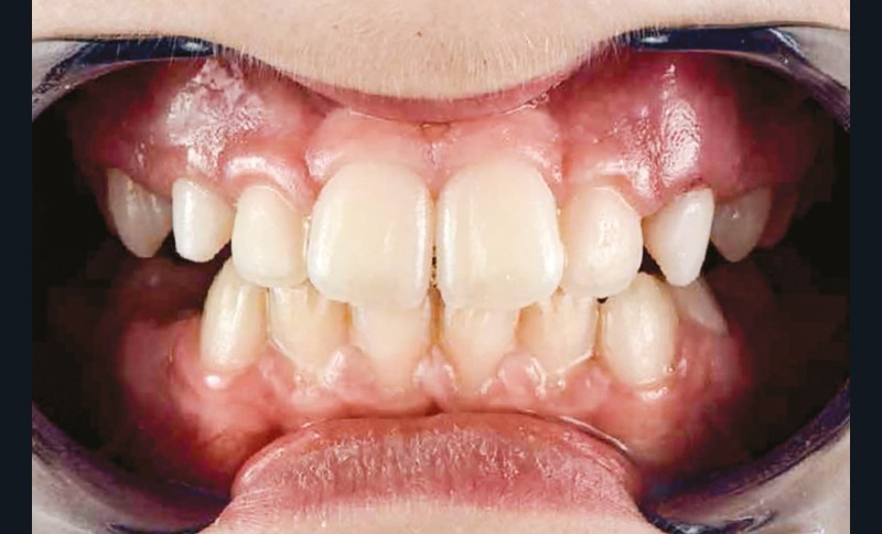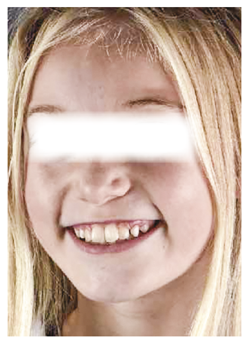 Emma a neuf ans. C’est la première fois qu’elle rencontre son nouveau praticien mais elle a déjà eu une mauvaise expérience avec un autre dentiste. De la salle d’attente, il l’invite à se rendre dans le studio photo. Cette pièce est plus accueillante que la salle de soins. Commencer par des photos de portrait (fig. 1) permet de visualiser les lignes du visage et du sourire tout en gardant un côté divertissant. Les photos intrabuccales sont réalisées avec un écarte-joues, comme dans le jeu mâche-mots (fig. 2).