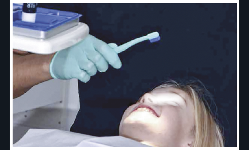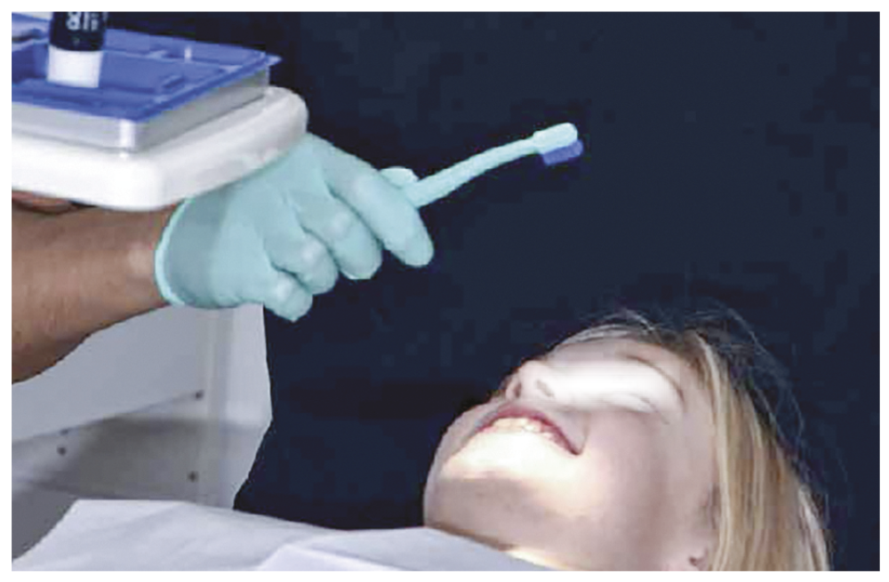 Les méthodes de brossage sont expliquées à Emma, même si elle présente une bonne hygiène bucco-dentaire (fig. 6). Une brosse à dents, qu’elle choisit selon la couleur qui lui plaît, lui est offerte pour la démonstration. Si le jeune patient présente un manque de brossage, nous utilisons la pâte magique qui dit la vérité, un révélateur de plaque, et il se brosse les dents jusqu’à élimination totale de couleurs sur les dents.