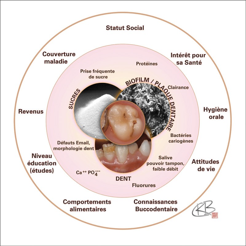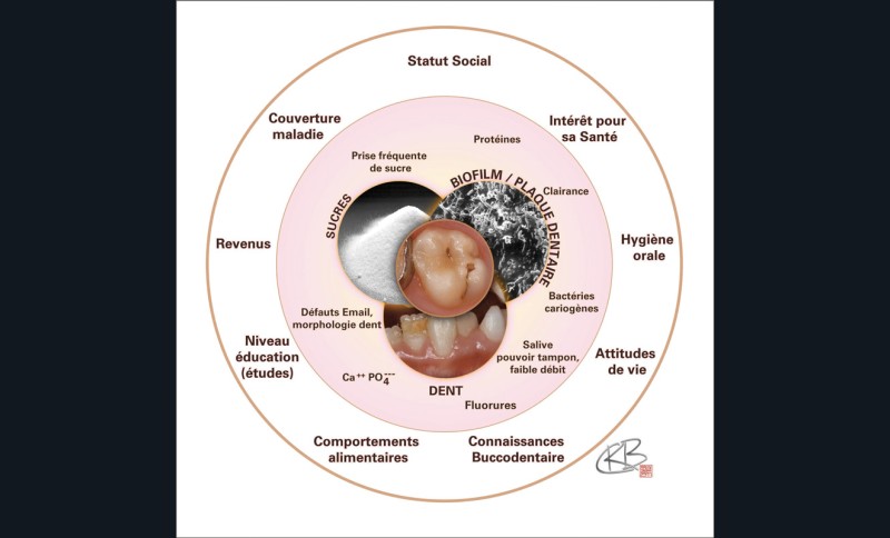 La maladie carieuse est une maladie infectieuse transmissible ; les lésions carieuses en sont le symptôme. Prendre en charge les symptômes tardifs par des traitements restaurateurs ne permet pas d’enrayer la maladie elle-même, mais uniquement de gérer les pertes de substance d’un point de vue fonctionnel et esthétique. Cette maladie est dite multifactorielle, car son apparition et son développement sont liés à la concomitance de trois facteurs étiologiques représentés par la présence de bactéries cariogènes, de sucres fermentescibles par celles-ci et une réponse de l’hôte qui ne permettra pas de contrebalancer les deux premiers éléments. Il existe d’autres facteurs de risque, définis comme des facteurs statistiquement liés à la maladie, plus ou moins modifiables, comme le niveau socio-économique. Ils comptent aussi les facteurs protecteurs qui contrebalancent un ou plusieurs des facteurs pathologiques précédemment cités, par exemple le fluor (fig. 1).