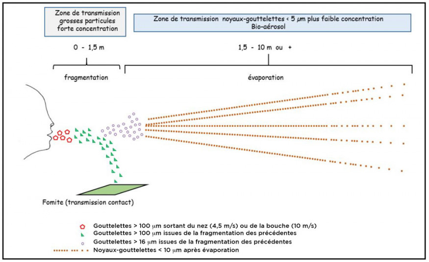 Ce bio-aérosol à fins noyaux-gouttelettes à concentration décroissante avec la distance de la source présente un risque infectieux potentiel à plusieurs mètres du sujet source (Li et coll., 2018), surtout dans des espaces confinés. La distanciation physique à 1,50 m trouve ici encore sa pleine justification.