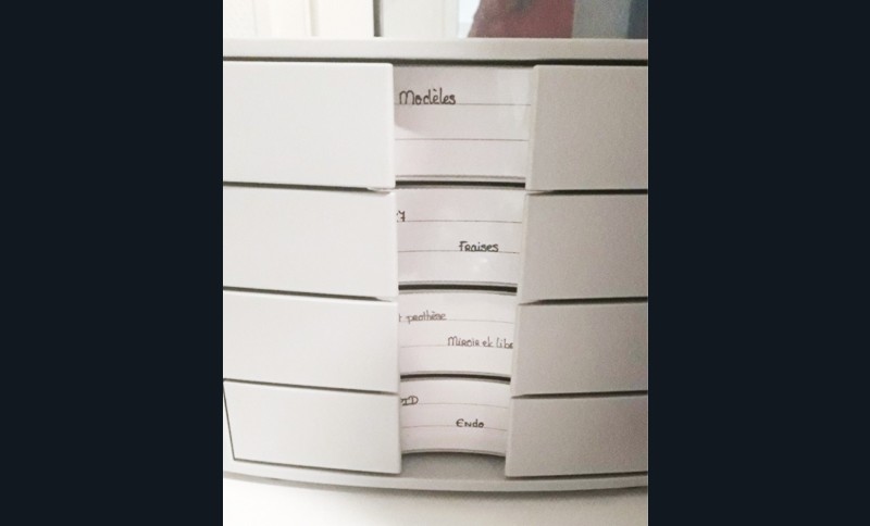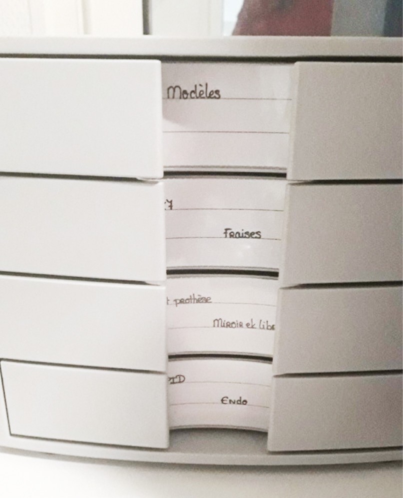 J’ai installé un module de classement de bureau fermé et étiqueté dans la salle de stérilisation. Tous les gabarits y sont rangés, ainsi que sachets prédécoupés.