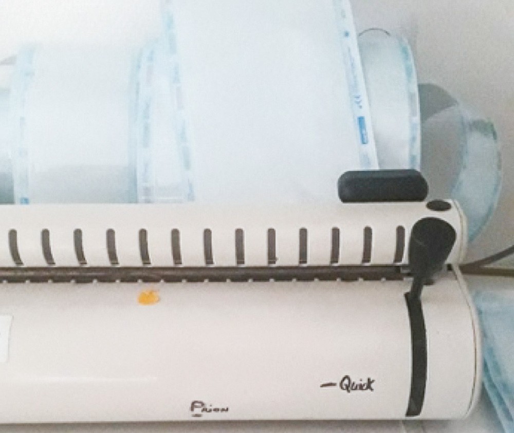 Lors de la stérilisation, il suffit de choisir le sachet prédécoupé adapté dans le module de classement et d’insérer l’instrument à l’intérieur du sachet, de refermer à l’aide de la soudeuse et de le disposer dans l’autoclave. Il faut compter une heure pour obtenir les sachets prédécoupés pour les stérilisations des deux mois suivants dans mon cabinet.