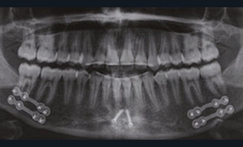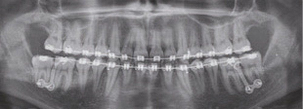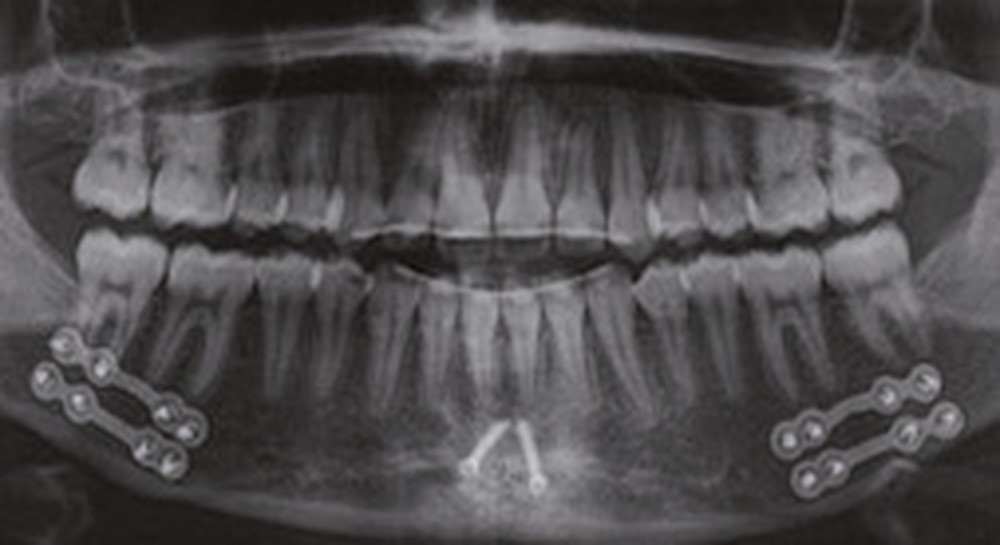 Nous équipons la patiente avec un appareil multi-attaches (.022 x .028 inch pré-informé Roth) mais nous n’avons pas activé l’arcade mandibulaire. La patiente est adressée au chirurgien maxillo-facial (Dr Gonzague Deffrennes, hôpital Beaujon) qui réalise l’avulsion des troisièmes molaires et la pose de plaques vissées avec émergence entre les premières et deuxièmes molaires mandibulaires dans l’axe des brackets (fig. 9). Étant donné l’absence d’encombrement au niveau incisif mandibulaire, nous pouvons rapidement mettre en place les tractions postérieures. Nous solidarisons ainsi le bloc antérieur de canine à canine et réalisons un recul en masse de l’arcade directement des canines aux plaques postérieures. La majeure partie du recul est faite sur un arc acier .018x.025 inch permettant le glissement. La force appliquée est de 250-300 g par côté.