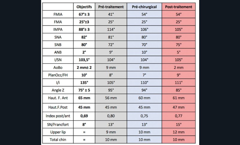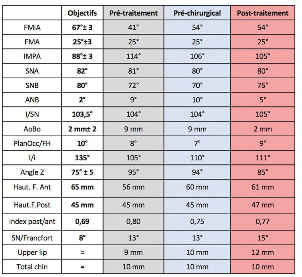La phase de préparation pré-chirurgicale a duré huit mois. La chirurgie a ensuite été reportée de trois mois par souhait de la patiente (départ en vacances puis volonté de réaliser la chirurgie durant des vacances scolaires). La phase de finition a été légèrement augmentée, du fait d’un mauvais port des élastiques de blocage par la patiente. Au total, le traitement a duré vingt-deux mois.