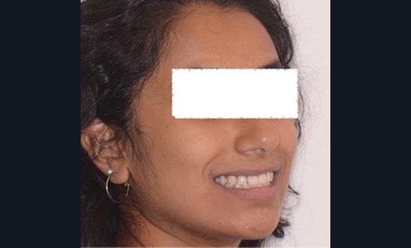 La patiente âgée de 16 ans et 2 mois, sans antécédent médical ni chirurgical, se présente dans le service d’orthopédie dento-faciale de l’hôpital Bretonneau pour un motif esthétique. Elle trouve ses dents trop en avant.