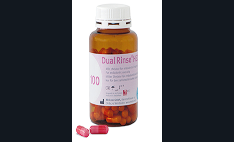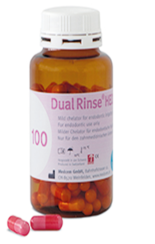 Une équipe suisse a mis sur le marché, il y a deux ans environ, une nouvelle molécule chélatante qui se mélange à la solution désinfectante. Présenté sous la forme d’une poudre conditionnée en gélule, le Dual Rinse HEDP est dissous dans l’hypochlorite de sodium en début de traitement.