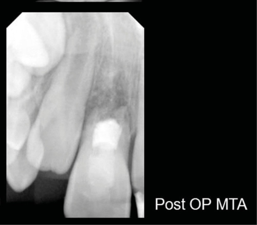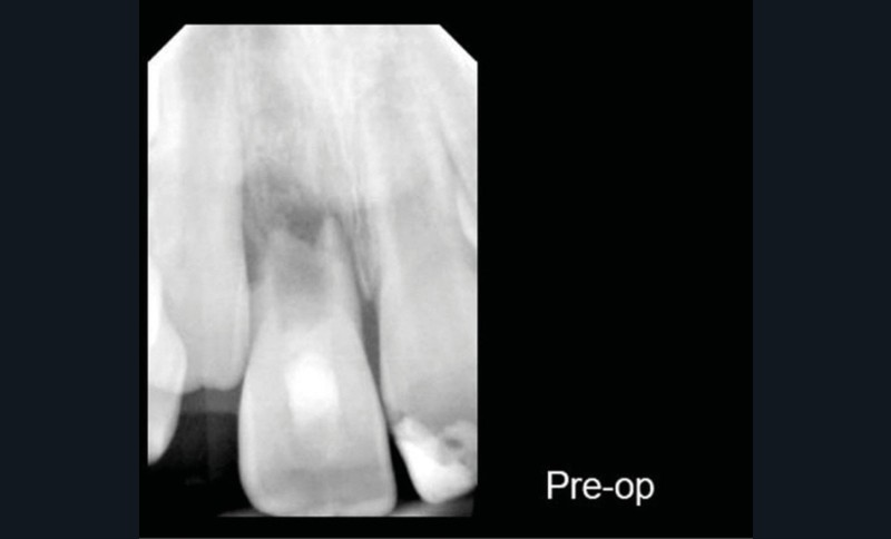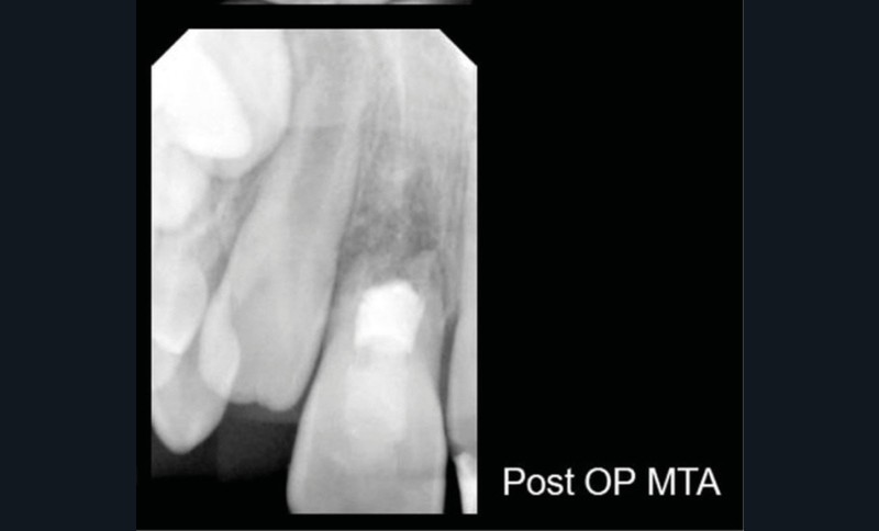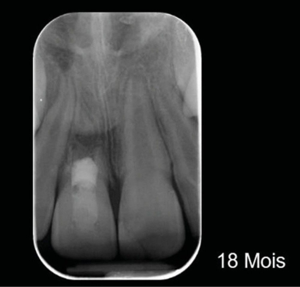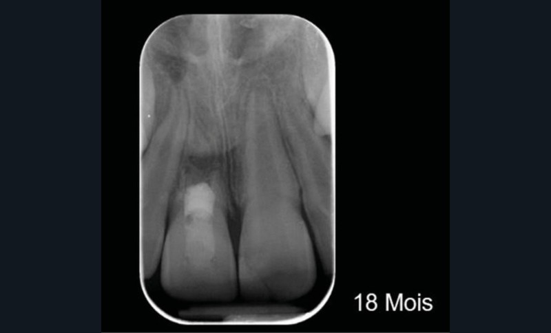 Ce cas clinique est particulier et illustre parfaitement l’évolution que suit l’endodontie depuis une dizaine d’années. Sans entrer dans le détail technique, cette dent expulsée avait été repositionnée dans son alvéole et un premier traitement de régénération intracanalaire tenté. Malheureusement suivi d’un échec. Le jeune âge de la patiente a été une motivation particulière pour tout tenter dans le but, au moins, de gagner du temps. Après plusieurs séances d’hydroxyde de calcium, l’apexification a été réalisée comme cela était possible. Le contrôle à 18 mois confirme que l’acharnement a payé.