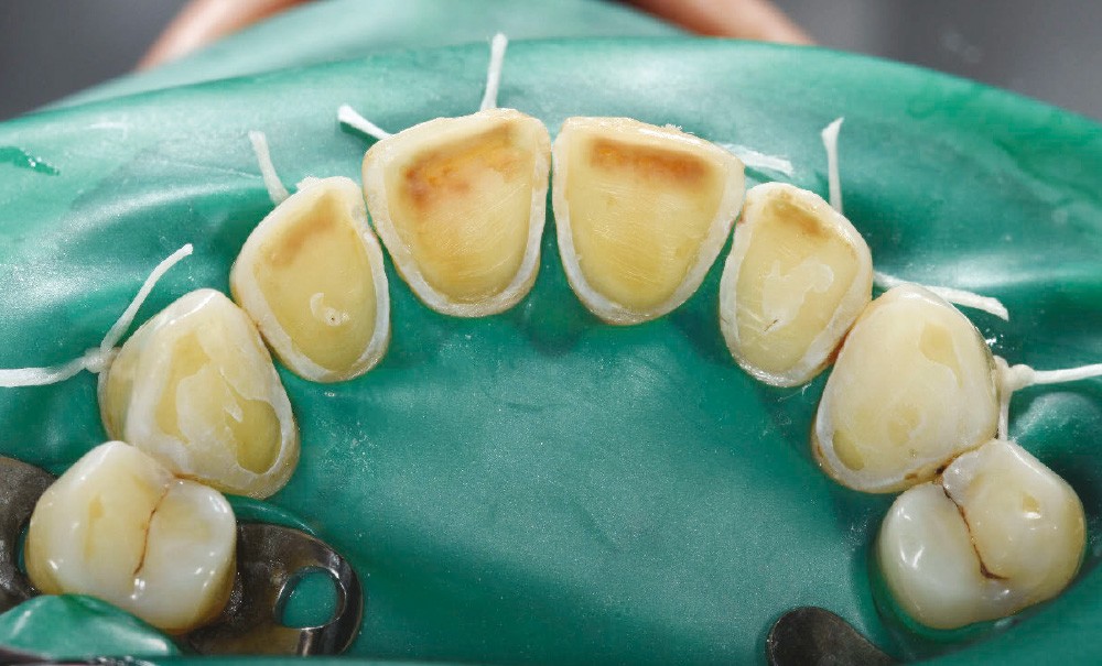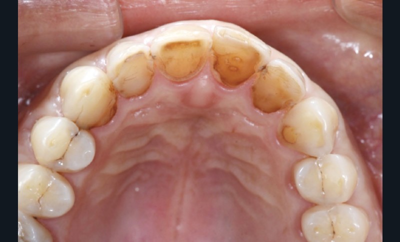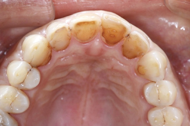 La patiente présente des lésions érosives en cupule, notamment sur le secteur antérieur maxillaire et sur la 36 (fig. 1 a-b). Elle présente par ailleurs divers composites anciens et infiltrés.