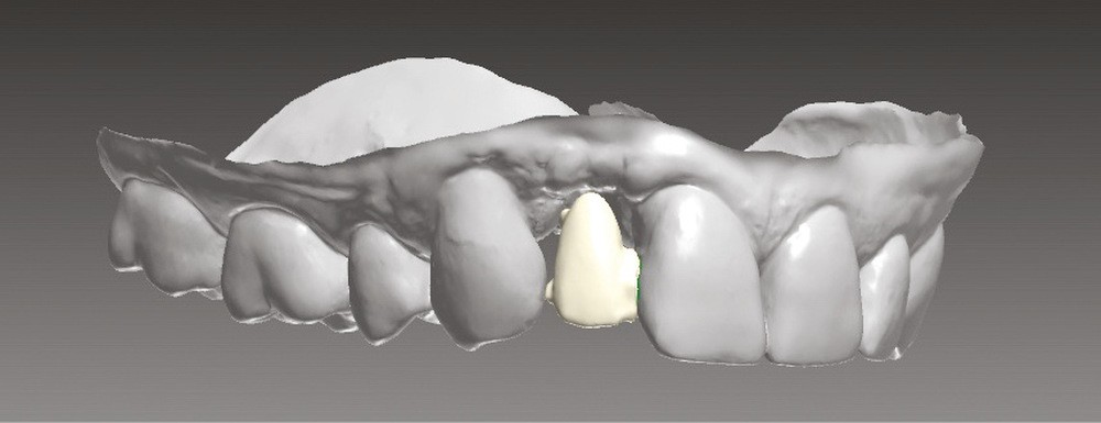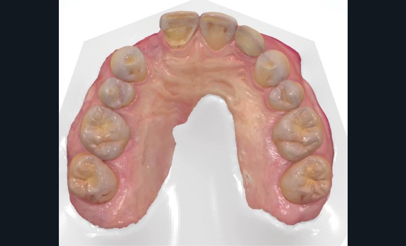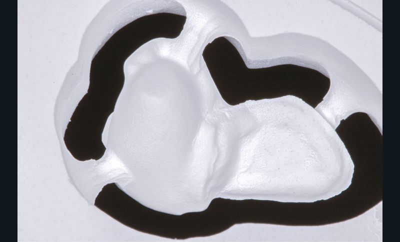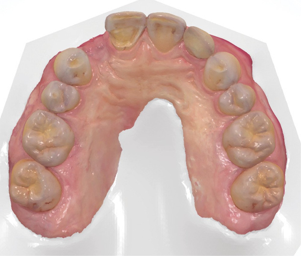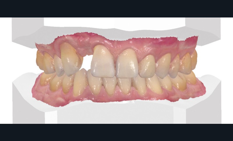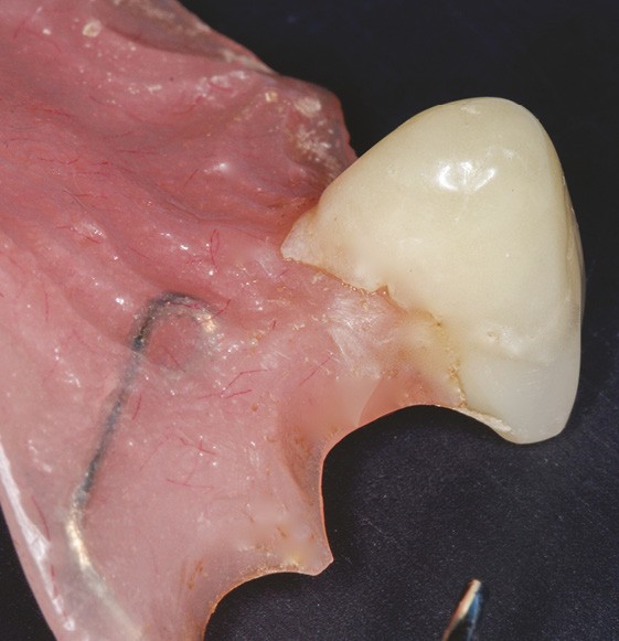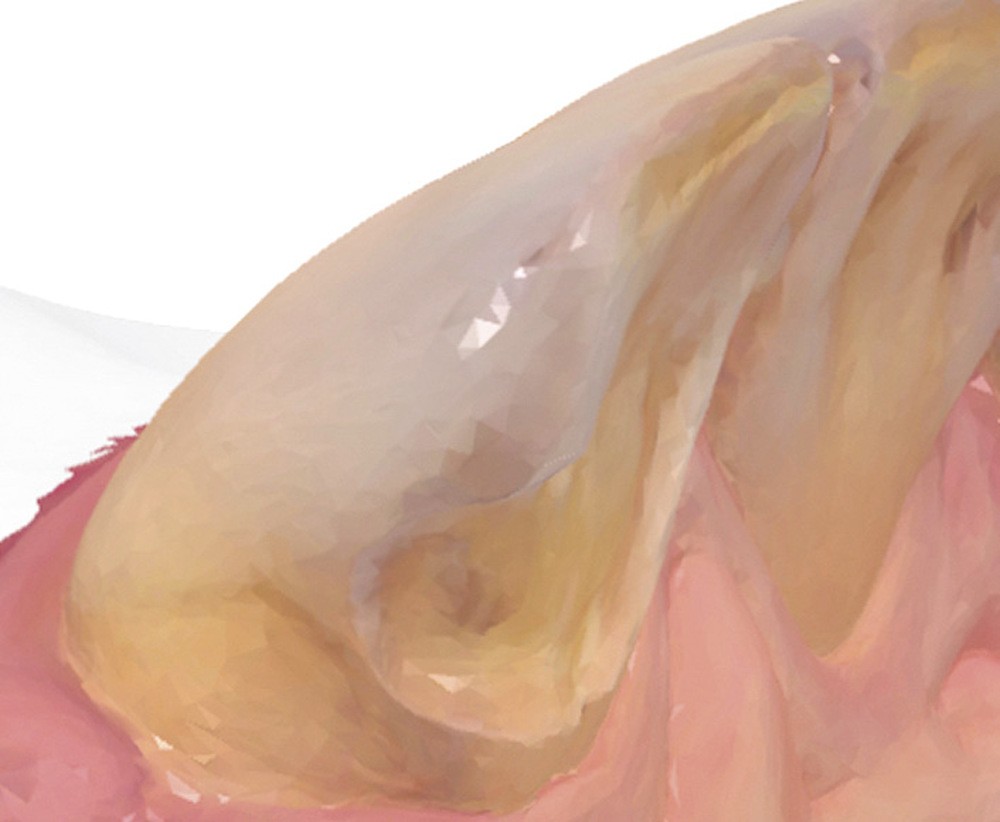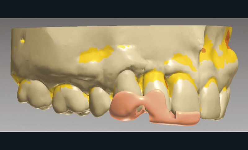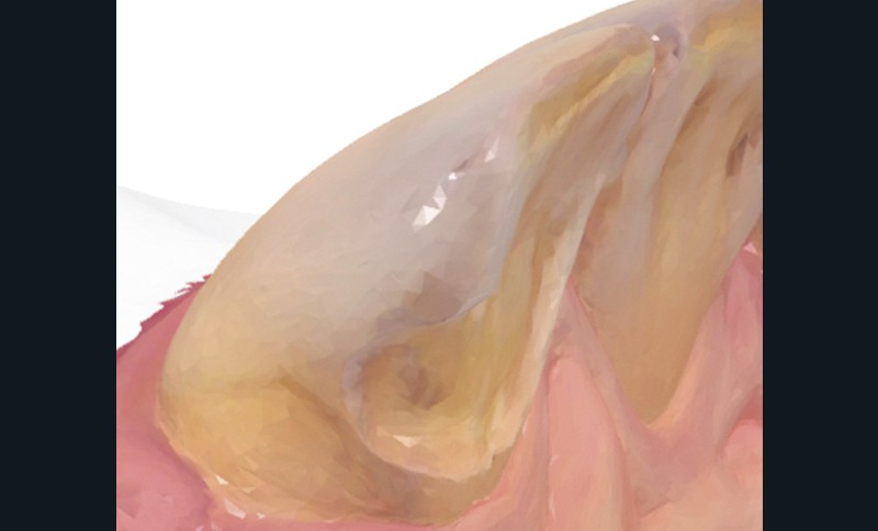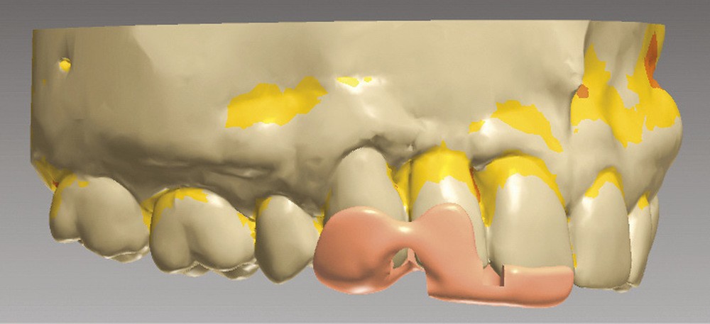 L’impression 3D du modèle de travail nécessaire à la stratification de la céramique cosmétique doit être retouchée au niveau de l’intermédiaire du bridge afin d’obtenir une légère compression du pontique. Se retrouve ici un désavantage de l’empreinte optique qui ne peut actuellement pas enregistrer la dépressibilité tissulaire. Il peut être alors judicieux de retravailler cette partie du modèle par fraisage ou en remplaçant la résine par du silicone.