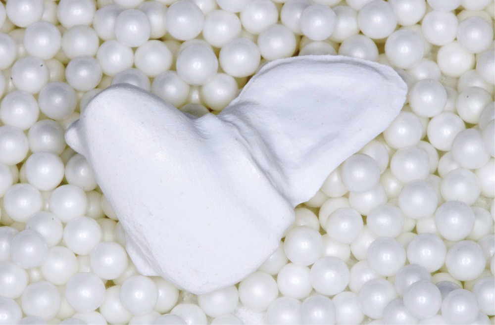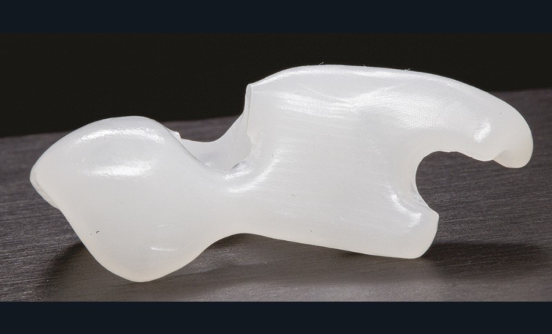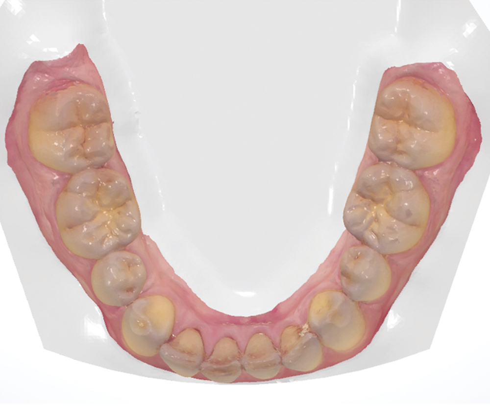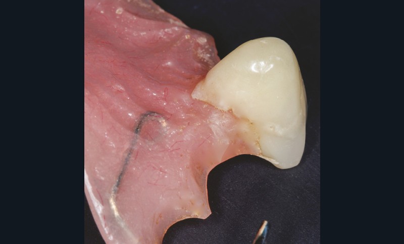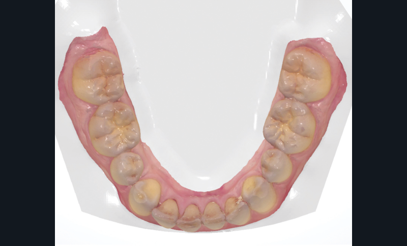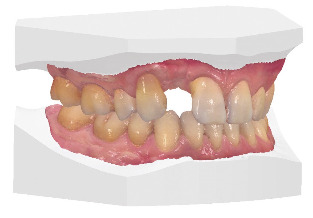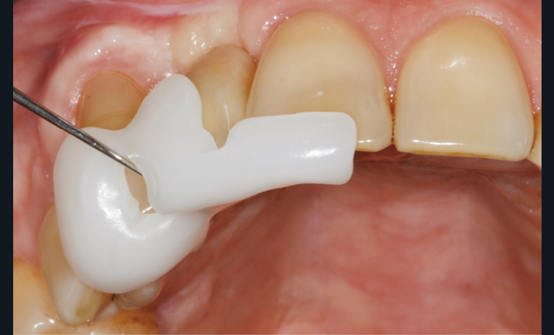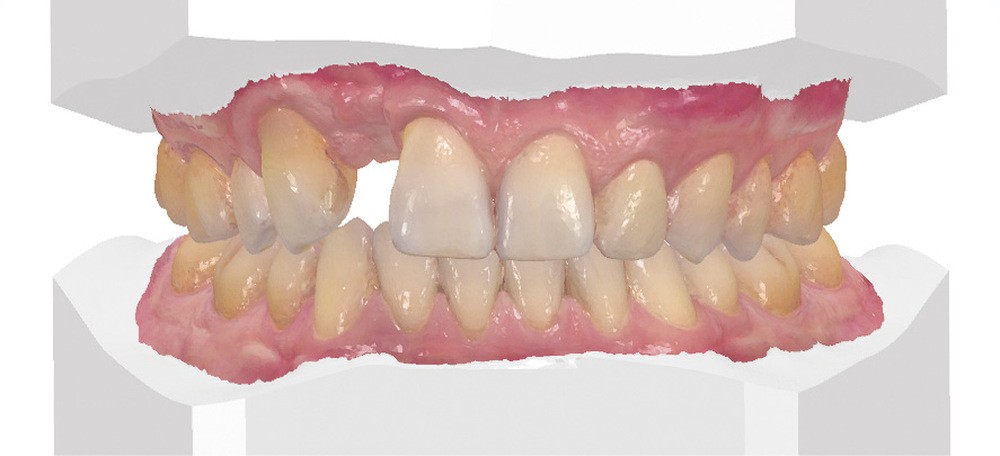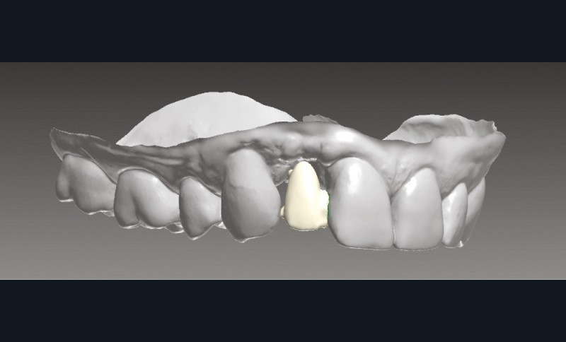L’impression 3D du modèle de travail nécessaire à la stratification de la céramique cosmétique doit être retouchée au niveau de l’intermédiaire du bridge afin d’obtenir une légère compression du pontique. Se retrouve ici un désavantage de l’empreinte optique qui ne peut actuellement pas enregistrer la dépressibilité tissulaire. Il peut être alors judicieux de retravailler cette partie du modèle par fraisage ou en remplaçant la résine par du silicone.