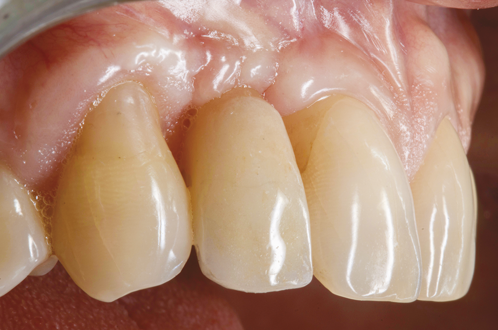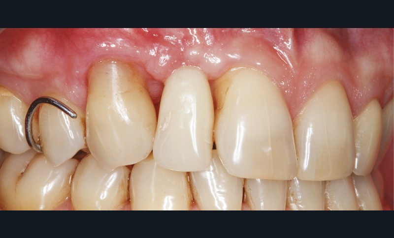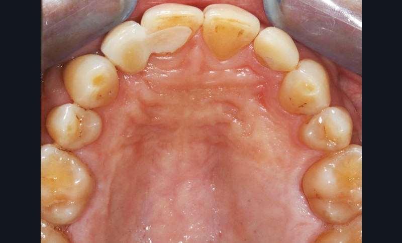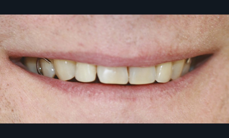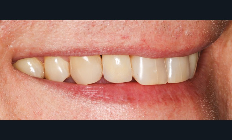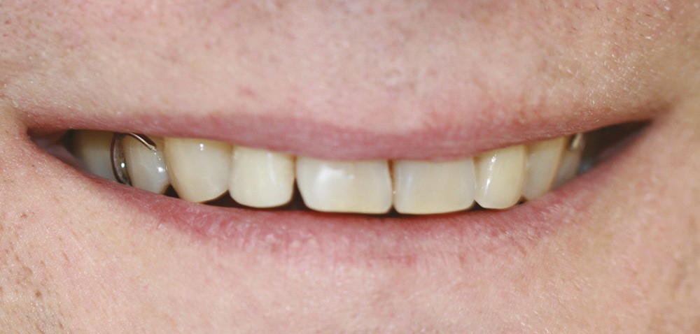 Le principal challenge de cette situation clinique fut de proposer au patient une solution fixe, respectant le gradient thérapeutique et sans aucune modification du parodonte, suite aux différents échecs implantaires et reconstitutions tissulaires effectuées par le passé. Le patient s’est en effet opposé à un aménagement chirurgical des tissus mous, qui aurait cependant été souhaitable pour parfaire l’intégration parodontale et esthétique du bridge collé.