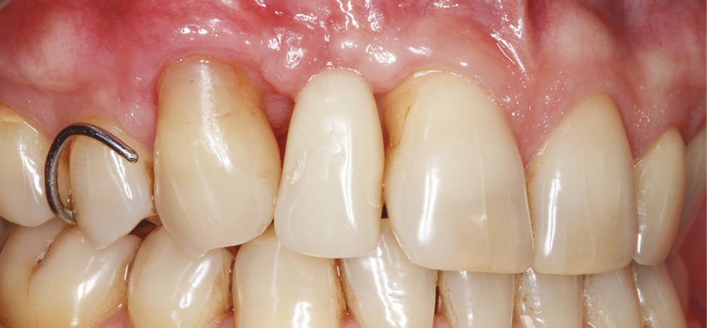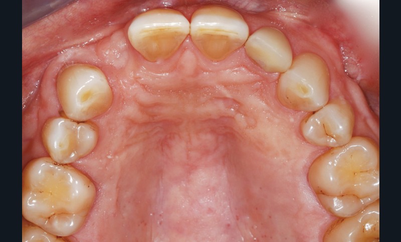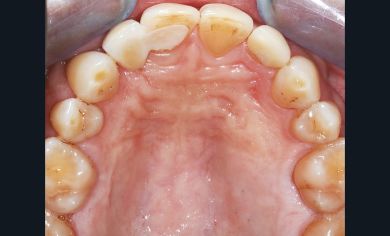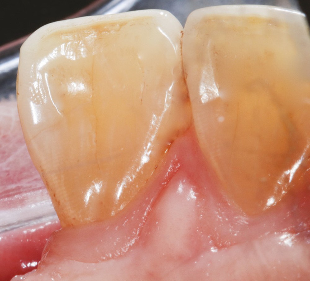Le patient exprime le souhait de ne plus subir d’intervention chirurgicale osseuse ou gingivale sur cette zone. La conséquence esthétique étant assez minime à distance sociale, notamment en raison de sa ligne du sourire basse, un traitement sans modification du parodonte est raisonnablement envisageable.