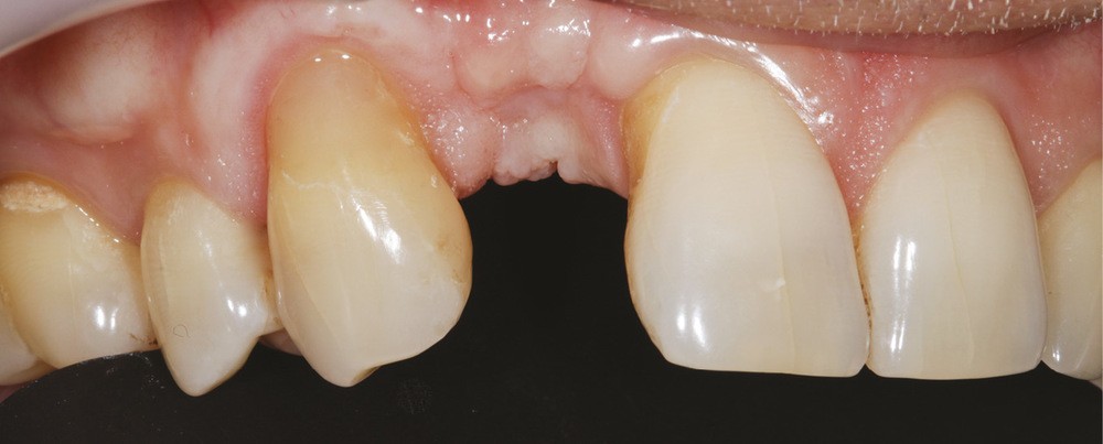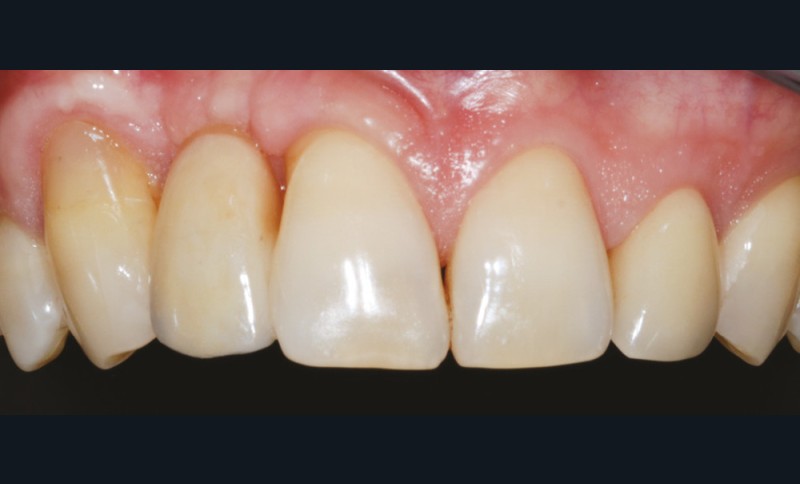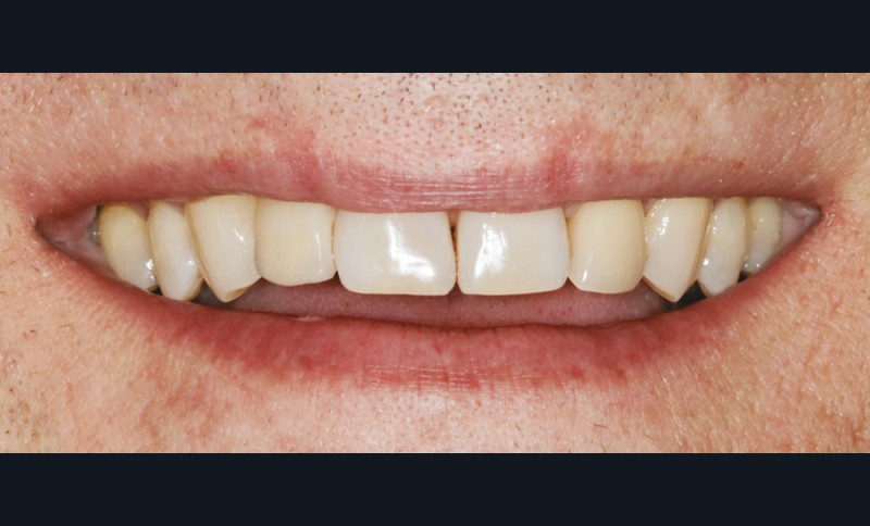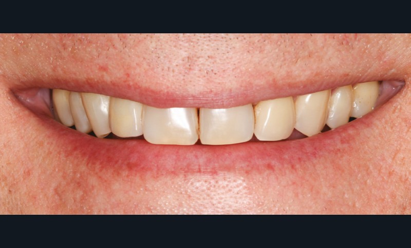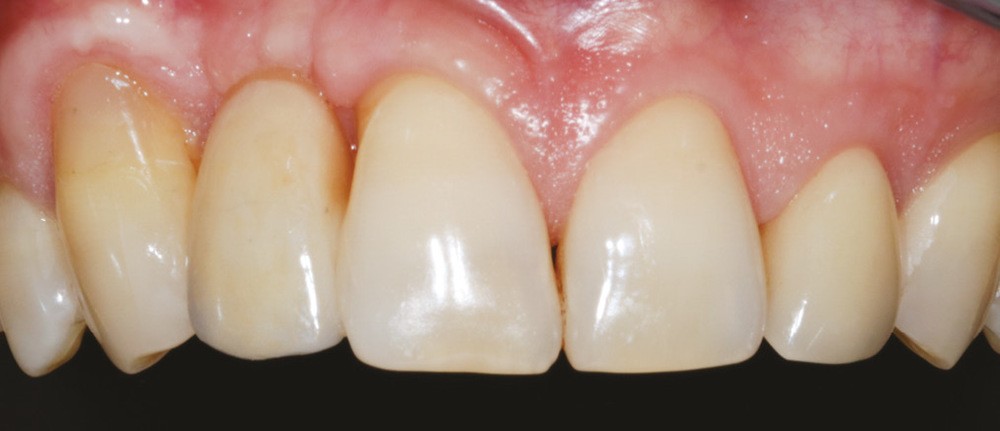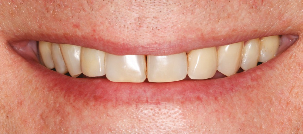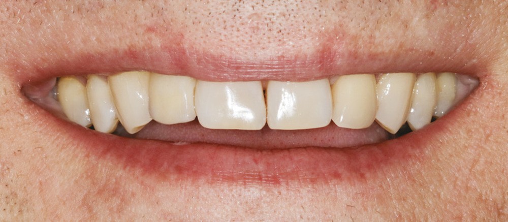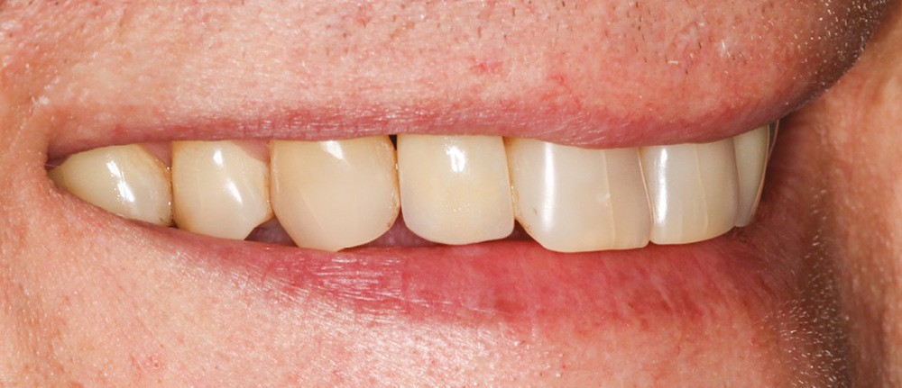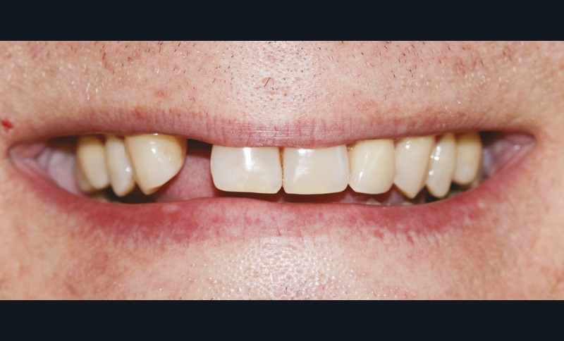 Un patient de 44 ans, n’ayant comme antécédents médicaux qu’une addiction au tabac, présente une agénésie des incisives latérales supérieures. L’incisive latérale gauche lactéale (62) a été traitée de longue date par une facette céramique satisfaisante sur le plan clinique et esthétique (fig. 1a). L’incisive latérale droite lactéale (52) a été extraite à la fin de son adolescence et remplacée par une prothèse fixe implanto-portée pendant plus de quinze ans.