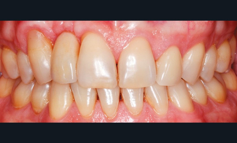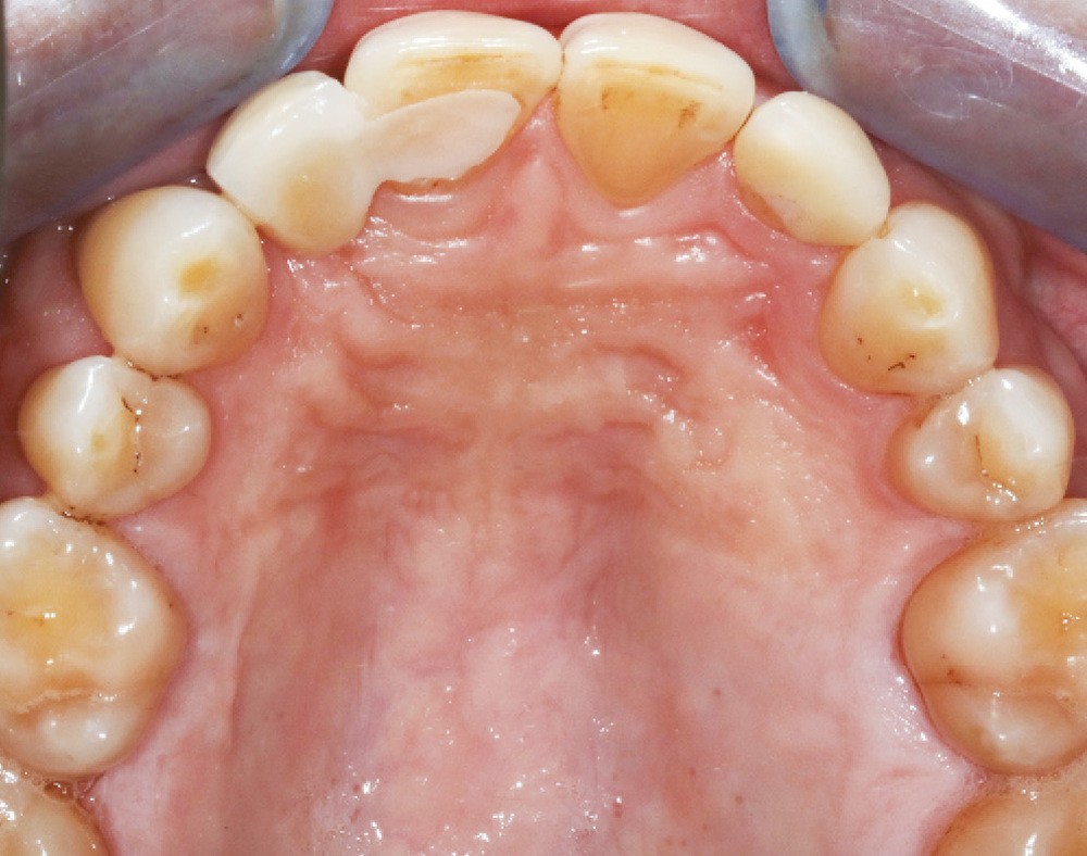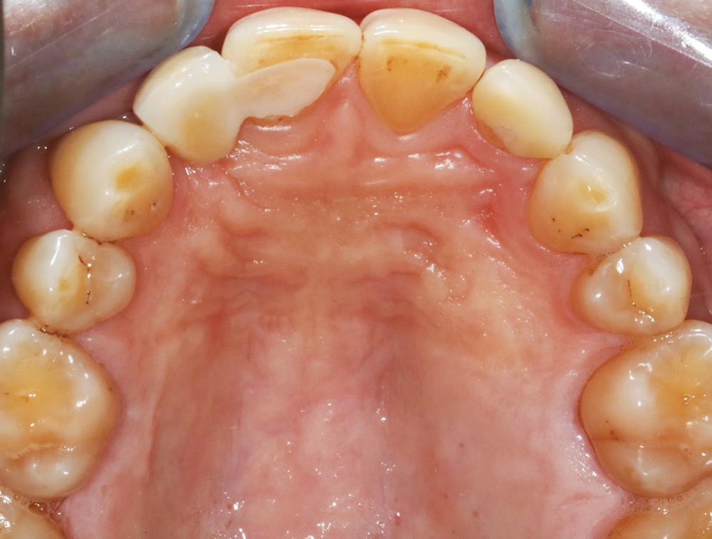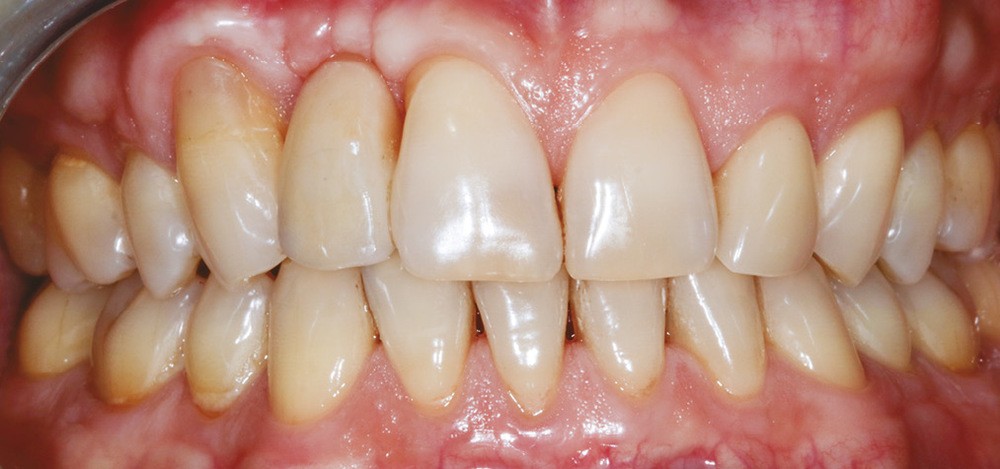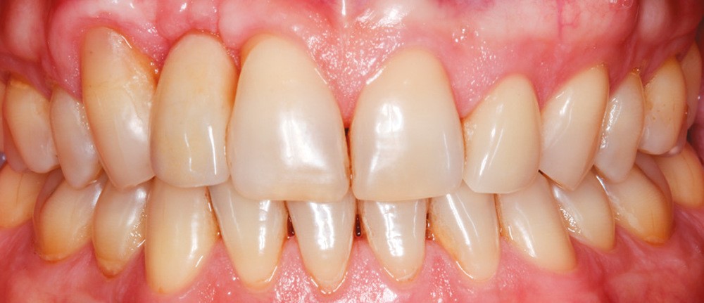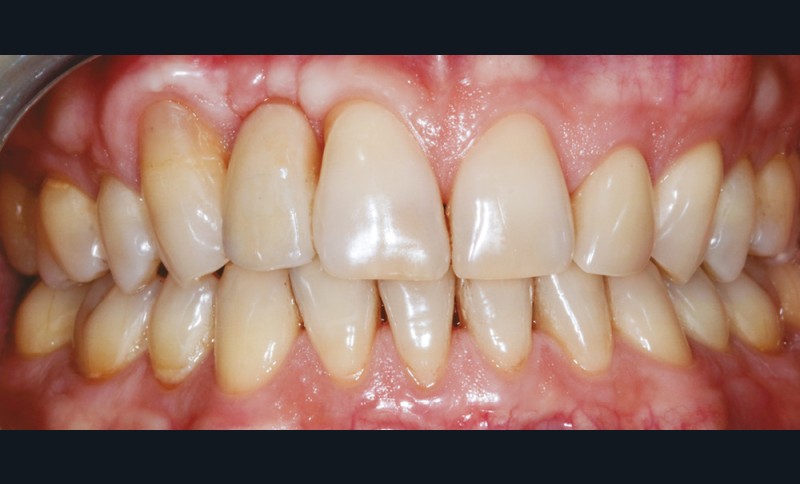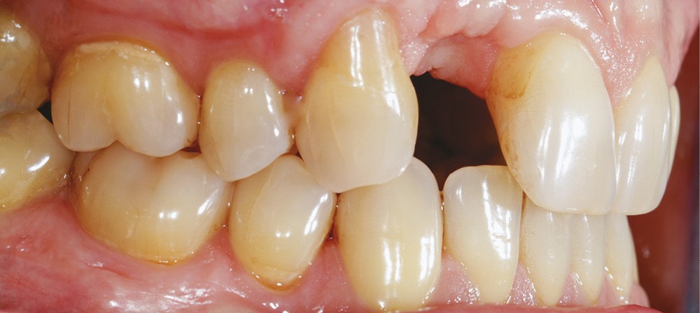 Un patient de 44 ans, n’ayant comme antécédents médicaux qu’une addiction au tabac, présente une agénésie des incisives latérales supérieures. L’incisive latérale gauche lactéale (62) a été traitée de longue date par une facette céramique satisfaisante sur le plan clinique et esthétique (fig. 1a). L’incisive latérale droite lactéale (52) a été extraite à la fin de son adolescence et remplacée par une prothèse fixe implanto-portée pendant plus de quinze ans.