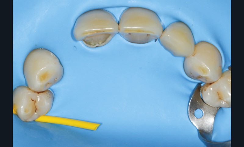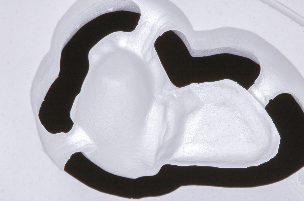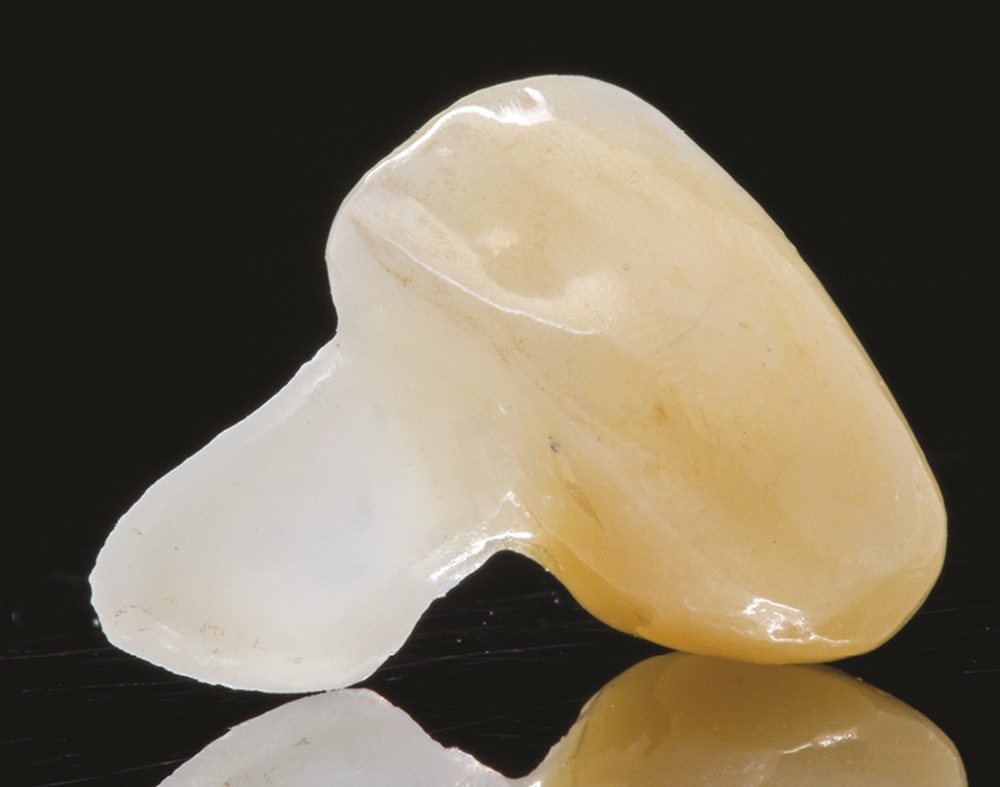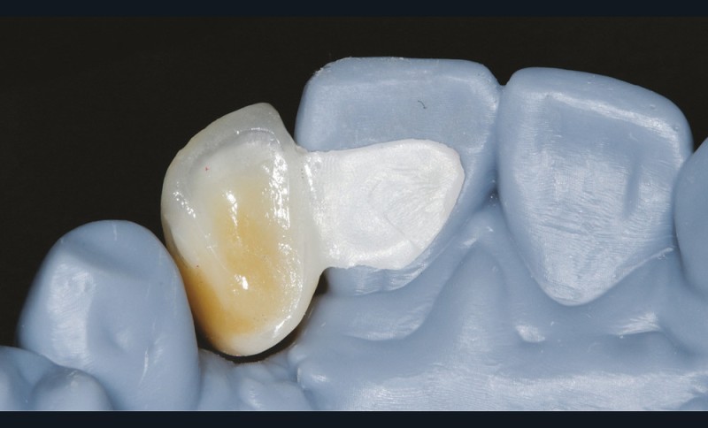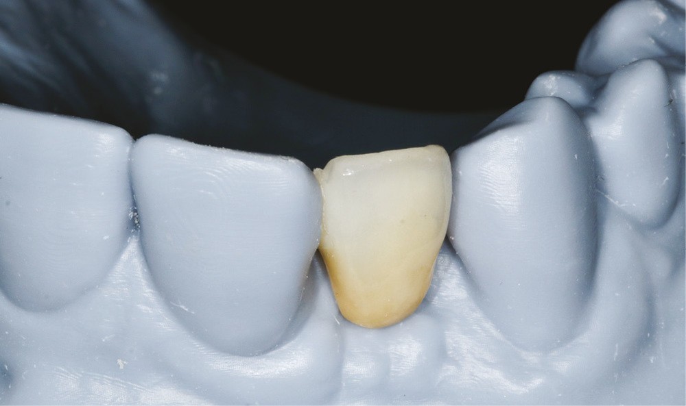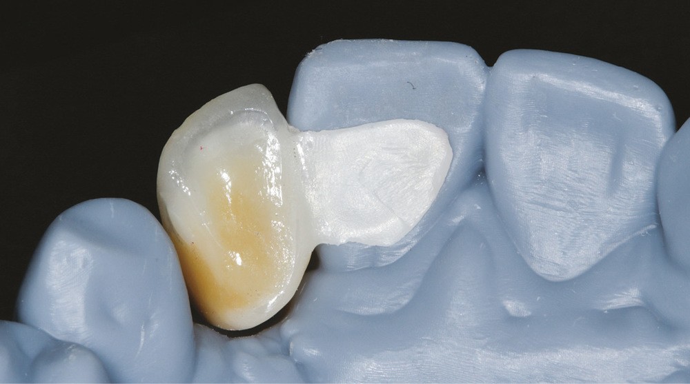 La zircone, grâce à ses excellentes qualités mécaniques, est le matériau sélectionné pour l’armature. Celle-ci sera surmontée d’une céramique cosmétique. La canine étant la « clé de voûte » de l’occlusion dynamique, l’incisive centrale droite (11) est choisie comme point d’appui pour l’ailette (fig. 3) [23]. De plus, la 11 est indemne de toute restauration et présente une surface tout à fait convenable pour assurer un maintien durable (30 mm2 au minimum) [24].