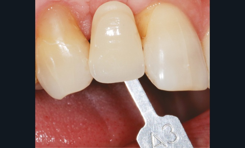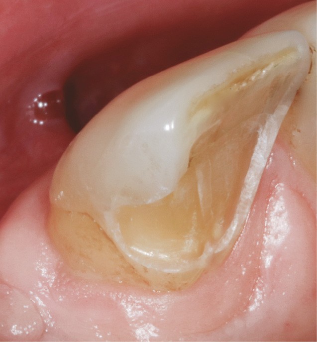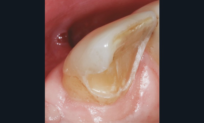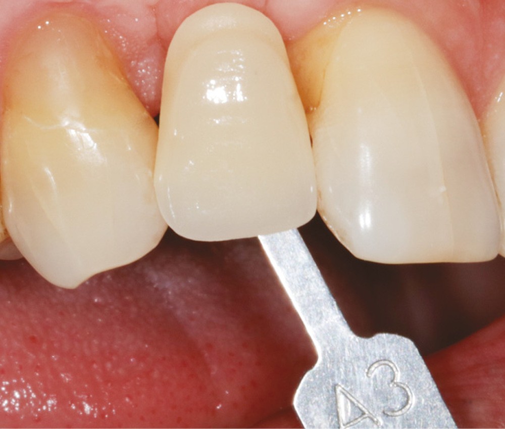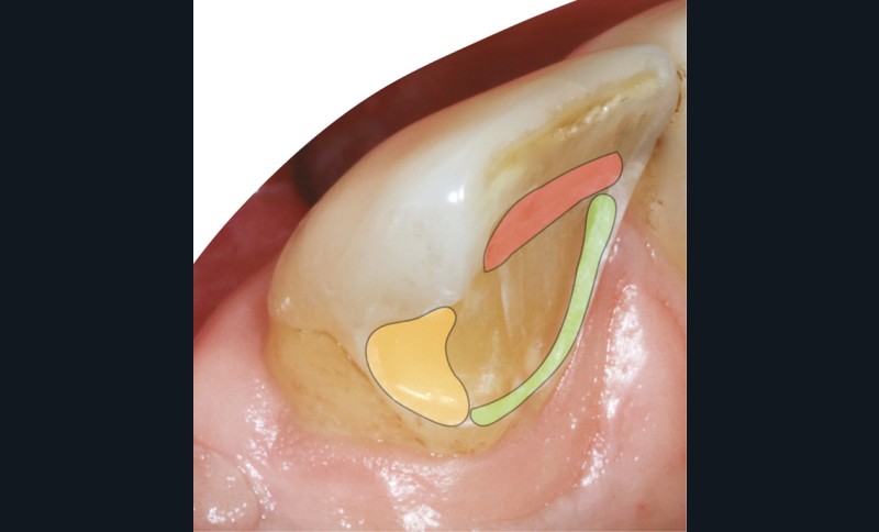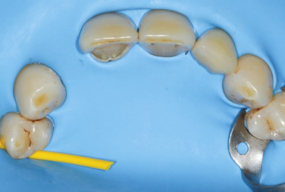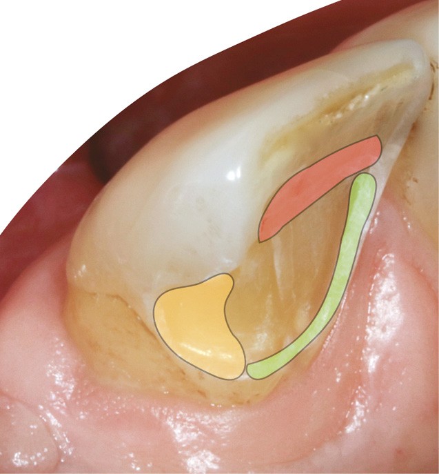 La zircone, grâce à ses excellentes qualités mécaniques, est le matériau sélectionné pour l’armature. Celle-ci sera surmontée d’une céramique cosmétique. La canine étant la « clé de voûte » de l’occlusion dynamique, l’incisive centrale droite (11) est choisie comme point d’appui pour l’ailette (fig. 3) [23]. De plus, la 11 est indemne de toute restauration et présente une surface tout à fait convenable pour assurer un maintien durable (30 mm2 au minimum) [24].