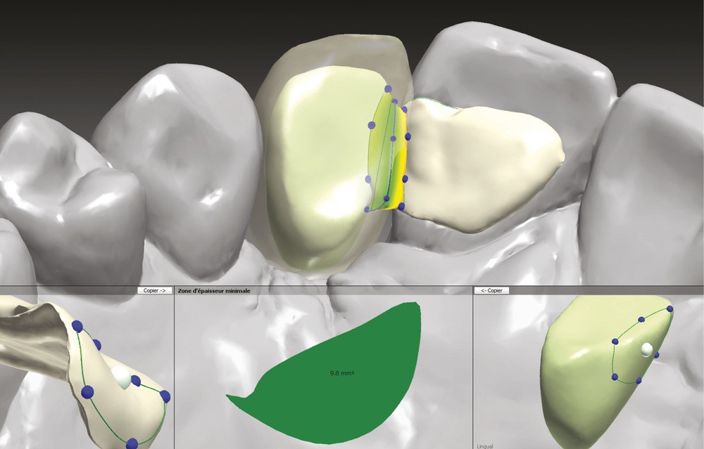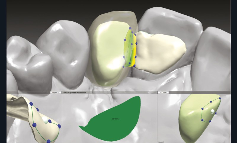 Aujourd’hui, la conception numérique offre un outil performant pour calculer efficacement la taille de la connexion, la surface de collage et les rayons de courbures. Cette gestion numérique est facilitatrice d’un contrôle optimal de ces paramètres, lors de la conception de l’élément prothétique.
