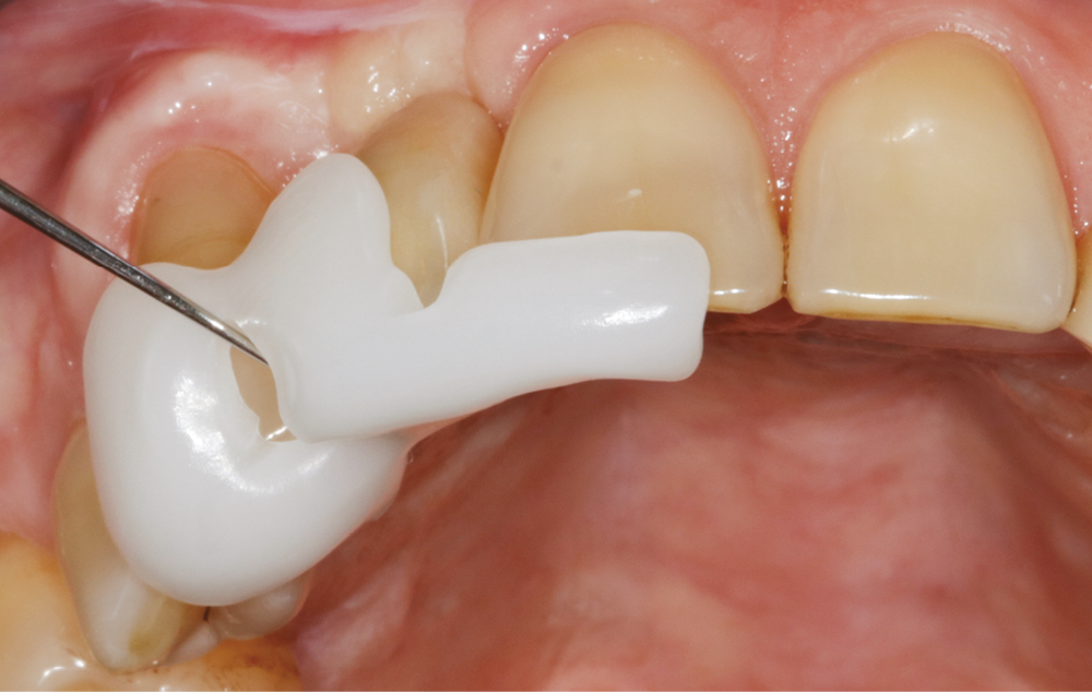 Le bridge cantilever est essayé en bouche et maintenu en place grâce à un composite de temporisation (Telio Inlay, Ivoclar Vivadent) (fig. 16). Cela permet la tenue suffisante de la pièce le temps d’effectuer le relevé des modifications à réaliser. L’absence de guidage fonctionnel de l’intermédiaire, le point de contact distal ainsi que les limites de l’ailette sont également vérifiés (fig. 17). Le bon positionnement de la restauration est contrôlé avec la clef (fig. 18). Après plusieurs essayages, une intégration esthétique naturelle est obtenue et validée par le patient (fig. 19).
