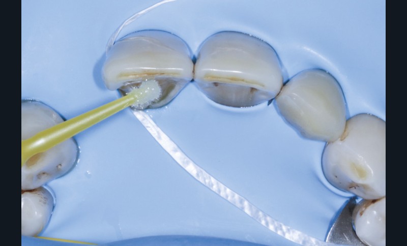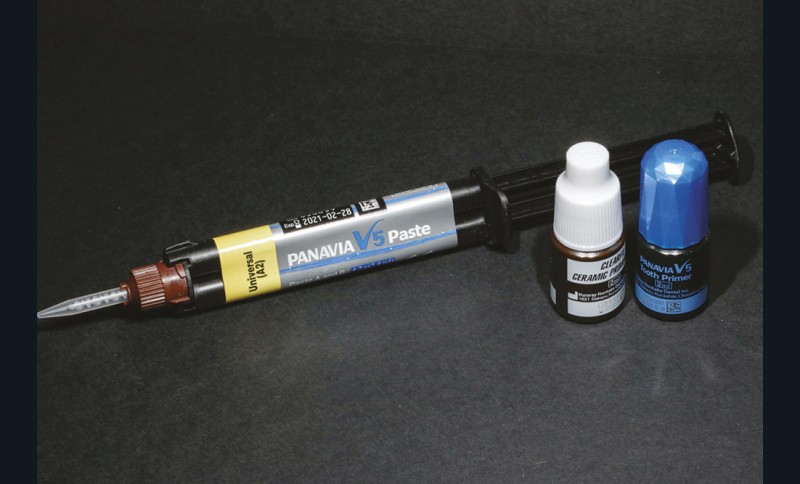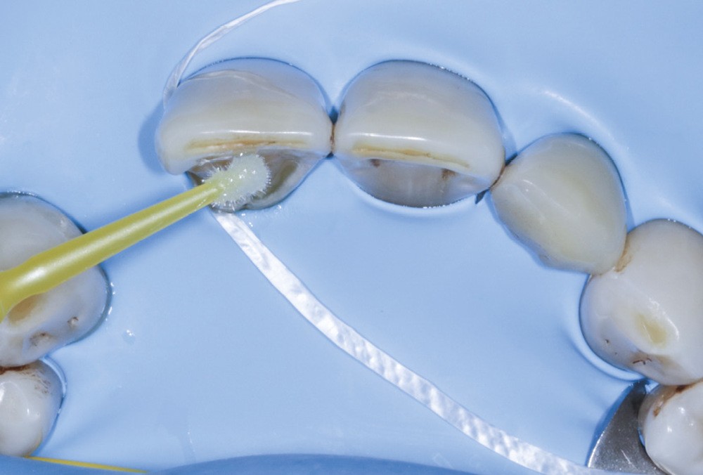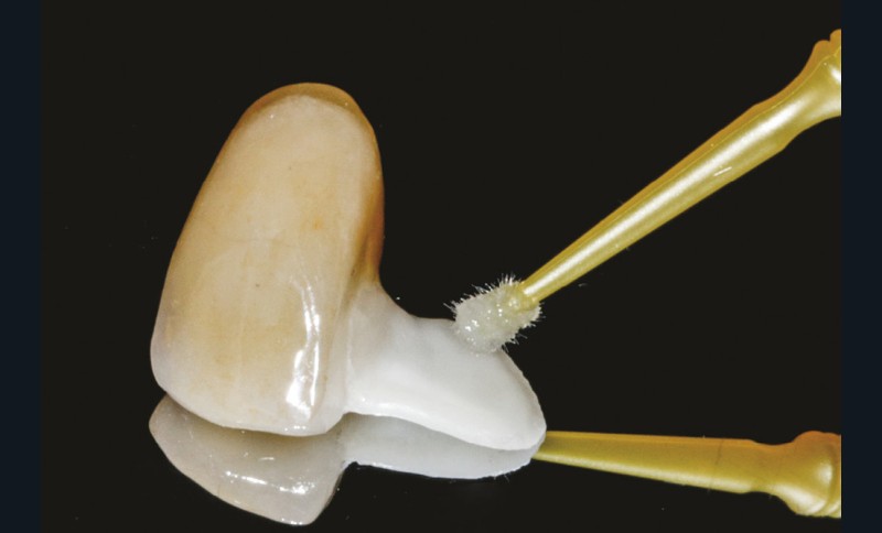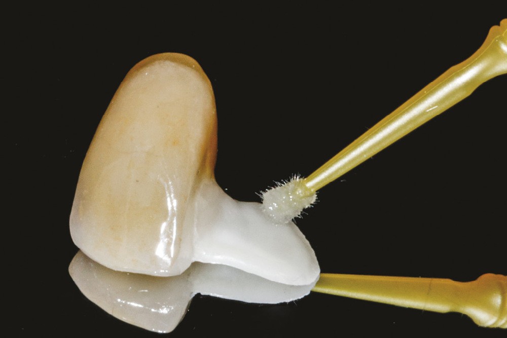 Le Clearfil Ceramic Primer (Kuraray Noritake) est appliqué sur la pièce prothétique pendant 20 secondes puis séché modérément (fig. 21). Une fois le champ opératoire (Nictone, MDC Dental) mis en place (fig. 22), le conditionnement tissulaire de la 11 se fait par mordançage à l’acide orthophosphorique 40 %, rinçage et séchage. Le Panavia V5 Tooth Primer (Kuraray Noritake) est ensuite appliqué sur la dent pendant 20 secondes, puis séché (fig. 23 et 24).