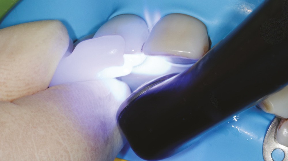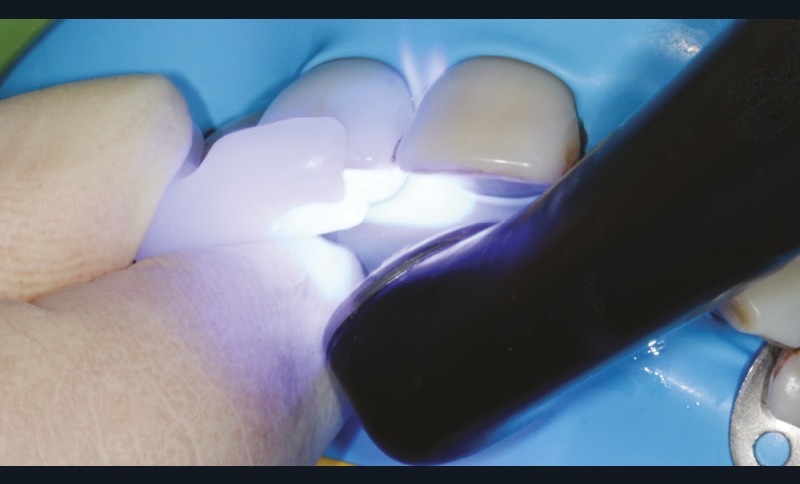 La difficulté majeure, lors de la phase d’assemblage, est le positionnement parfait de la pièce prothétique pendant le collage sous digue. Une clef permet de surmonter cette complexité. Le design particulier de cette clef « papillon », en appui sur les dents adjacentes permet de maintenir l’élément prothétique dans sa position (malgré l’effet de rebond de la digue), tout en permettant un contrôle visuel et un accès facile pour retirer les excès de colle [23].