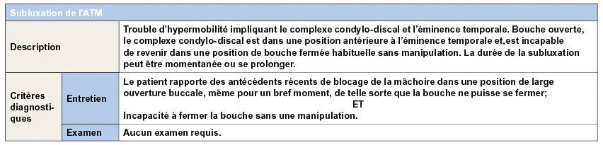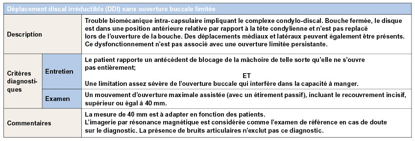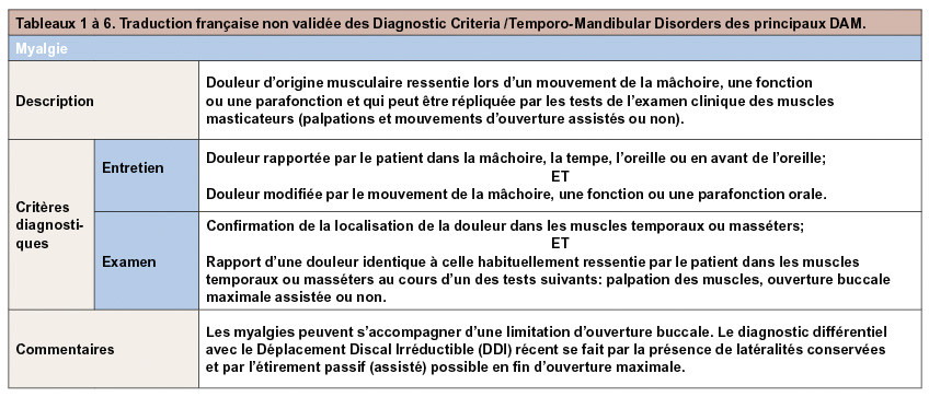 Pour dépister ces troubles musculo-squelettiques, il est nécessaire de préciser clairement les critères diagnostiques. En 2014, un regroupement d’experts a publié une mise à jour des critères qui servent actuellement de référence dans la littérature [1, 2], les DC/TMD (Diagnostic Criteria/Temporo-Mandibular Disorders). Dans l’attente d’une version française validée, nous vous proposons notre traduction de la version originale sous forme de tableaux (1 à 7).