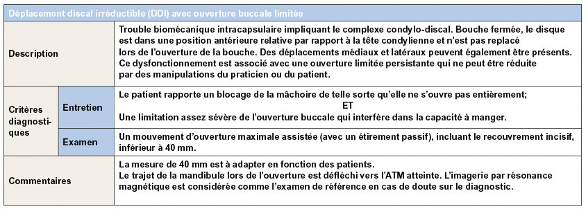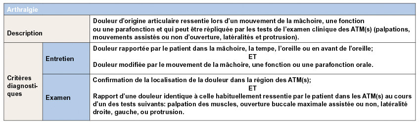 Pour dépister ces troubles musculo-squelettiques, il est nécessaire de préciser clairement les critères diagnostiques. En 2014, un regroupement d’experts a publié une mise à jour des critères qui servent actuellement de référence dans la littérature [1, 2], les DC/TMD (Diagnostic Criteria/Temporo-Mandibular Disorders). Dans l’attente d’une version française validée, nous vous proposons notre traduction de la version originale sous forme de tableaux (1 à 7).