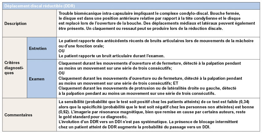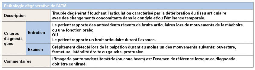 Pour dépister ces troubles musculo-squelettiques, il est nécessaire de préciser clairement les critères diagnostiques. En 2014, un regroupement d’experts a publié une mise à jour des critères qui servent actuellement de référence dans la littérature [1, 2], les DC/TMD (Diagnostic Criteria/Temporo-Mandibular Disorders). Dans l’attente d’une version française validée, nous vous proposons notre traduction de la version originale sous forme de tableaux (1 à 7).