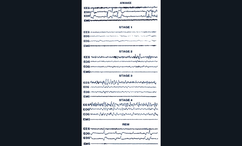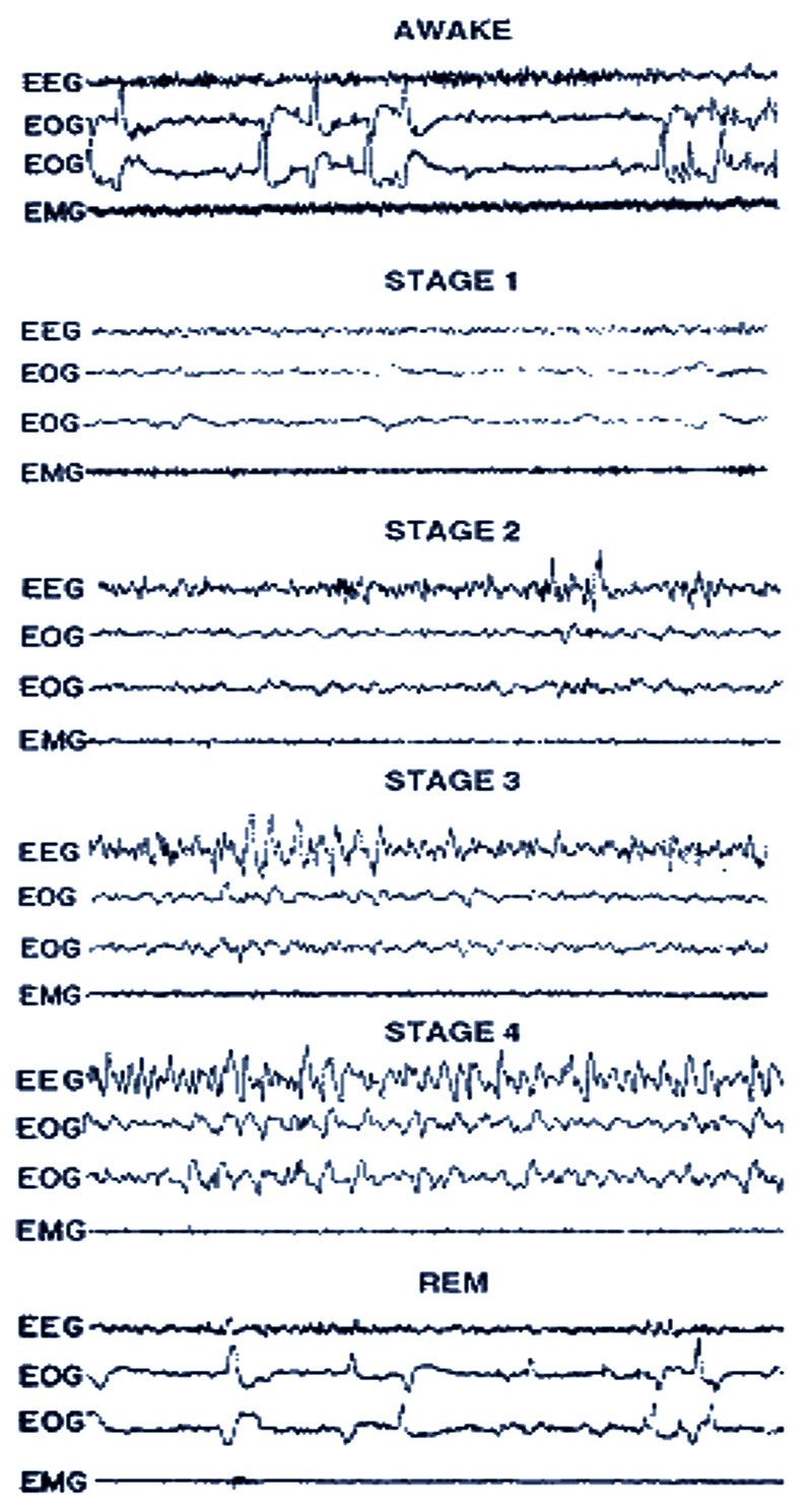 Le sommeil normal se compose de quatre à six cycles de 60 à 80 minutes, composés chacun de quatre stades : la période d’endormissement (stade 1), le sommeil lent léger (stade 2), le sommeil lent profond (stade 3) et le sommeil paradoxal (stade 4) ou REM (rapid-eye-movement) qui marque le réveil de l’activité cérébrale (fig. 1).