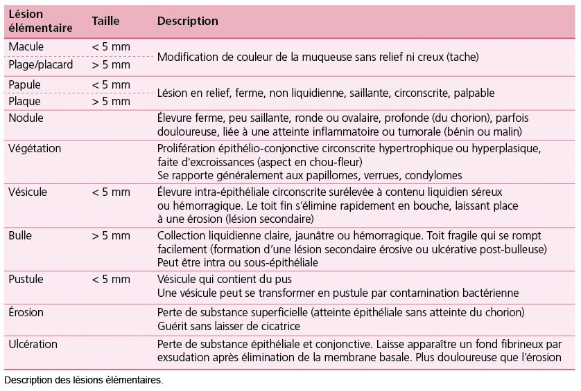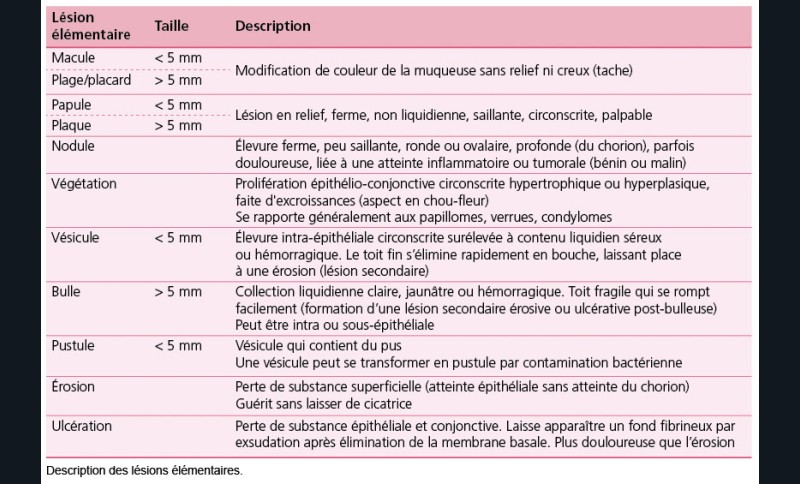 Si l’on pouvait classer les lésions orales en catégories, on distinguerait les lésions bénignes, les lésions malignes et les manifestations orales de maladies systémiques ou dermatologiques. On identifie plusieurs lésions élémentaires (voir tableau ci-contre).