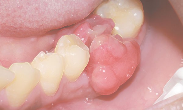 De nombreuses tumeurs bénignes sont retrouvées dans la cavité orale. La plus fréquente est l’épulis. C’est une pseudo-tumeur gingivale dont la principale forme est l’épulis inflammatoire. Le diagnostic se fait face à une tumeur gingivale, généralement hémorragique, en bissac (fig. 6a et b), avec une cause irritative retrouvée (racines résiduelles, tartre, restauration débordante…). Chez la femme enceinte, on retrouve des épulis dits gravidiques…