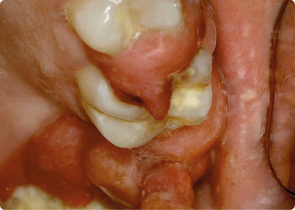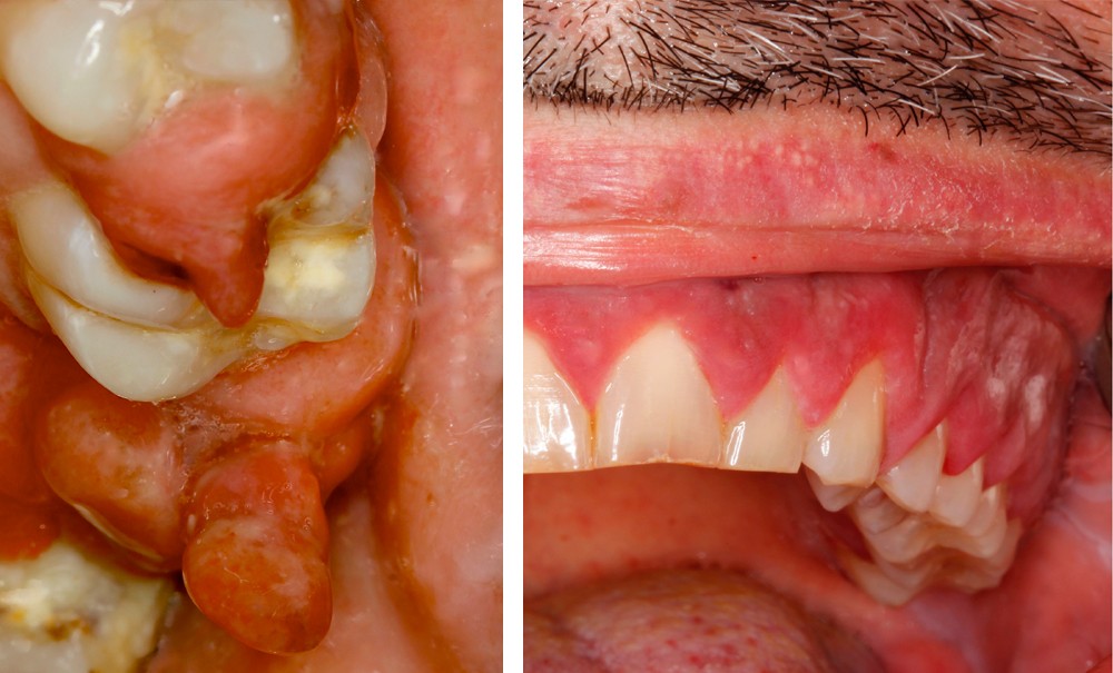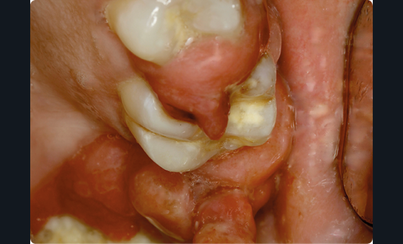 • On observait une hyperplasie gingivale intéressant les 4 régions molaire-prémolaire, avec des dents plus ou moins mobiles ; les secteurs antérieurs étaient épargnés. Cette hyperplasie gingivale était par endroits très volumineuse et prenait parfois l’aspect d’un granulome pyogénique.