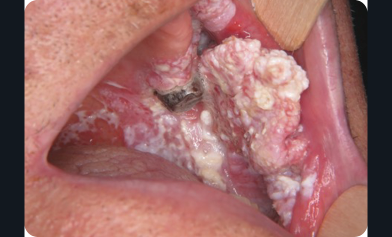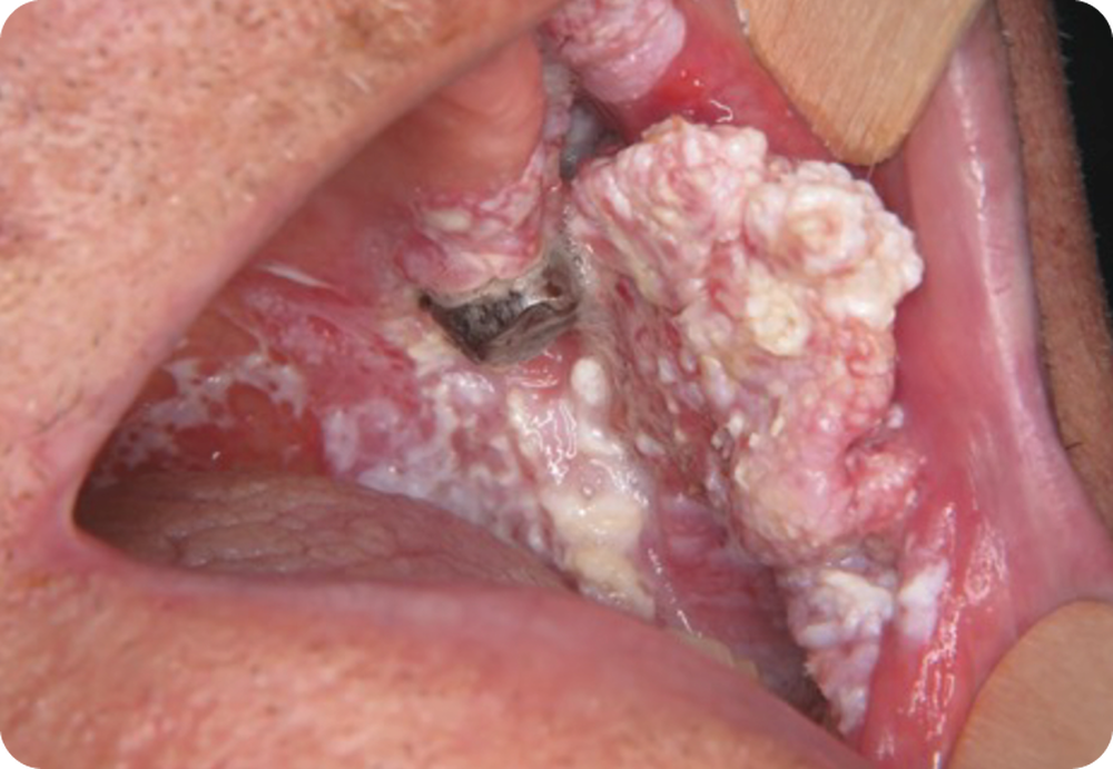 Il s’agissait d’un carcinome verruqueux diagnostiqué à partir des données de l’examen clinique et de la biopsie. Le carcinome verruqueux, autrefois appelé papillomatose orale floride, est une lésion qui ressemble, sur le plan clinique, à un chou-fleur. Il s’agit d’une lésion exophytique, qui a tendance à s’étendre en surface mais peu en profondeur. Cette lésion ne se complique pas d’adénopathie métastatique mais peut évoluer vers un carcinome…