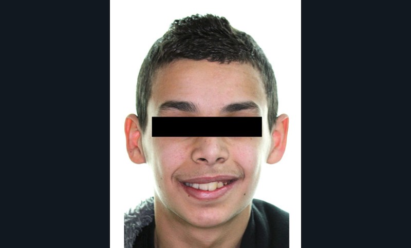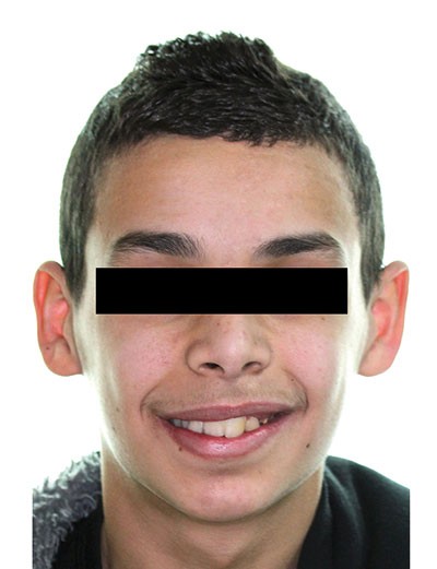 De face, Younesse présente un sourire gingivo-dentaire dissymétrique par contraction labiale unilatérale et un milieu inter-incisif dévié à droite de 2 mm par rapport au plan sagittal médian (fig. 2).