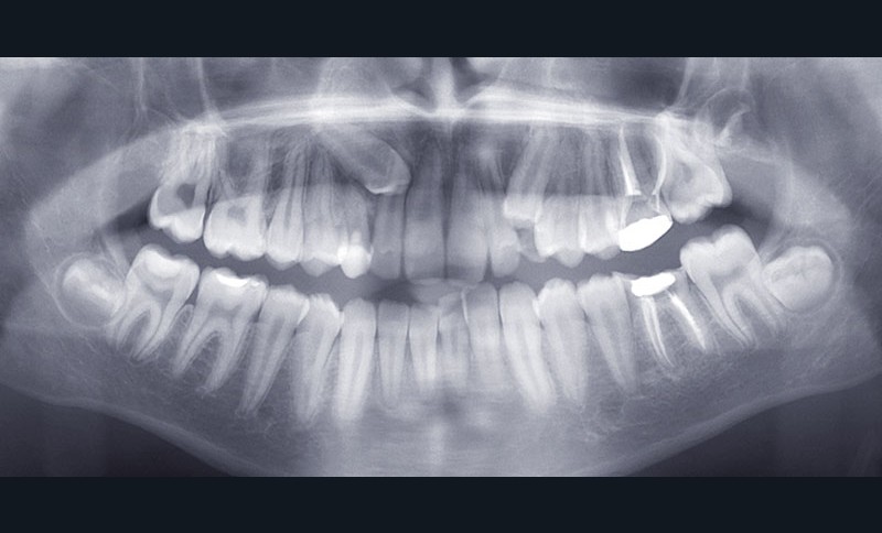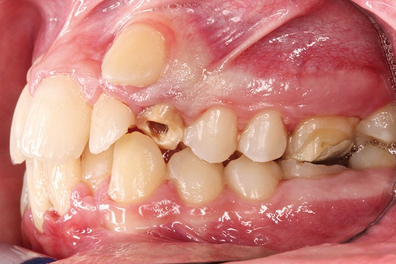 • Endo-buccal : Younesse présente un contrôle de plaque dentaire insuffisant, la persistance de 53 et 63, des soins en cours de réalisation sur 26 et 36, un encombrement maxillo-mandibulaire avec infravestibulotopie de 23 et une suspicion d’inclusion de 13 sur un schéma de Classe II subdivision droite (fig. 3 à 7).