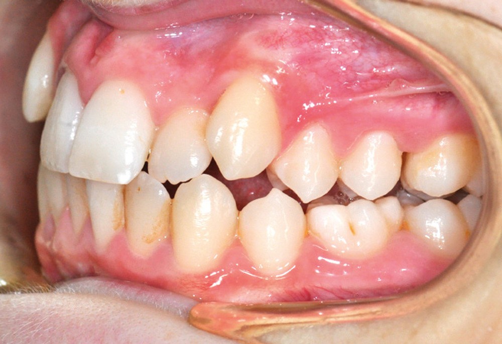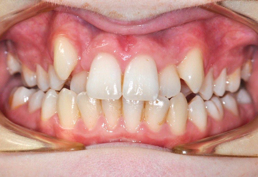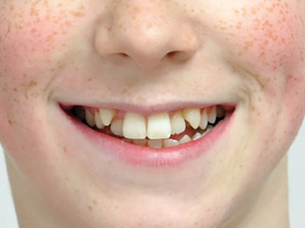 Le patient présente des lèvres fines et un profil orthofrontal avec des pommettes effacées. Le sourire est inesthétique du fait de l’encombrement maxillaire, mais aussi en raison de la contraction asymétrique de la lèvre inférieure.