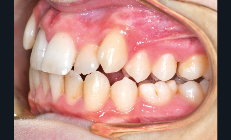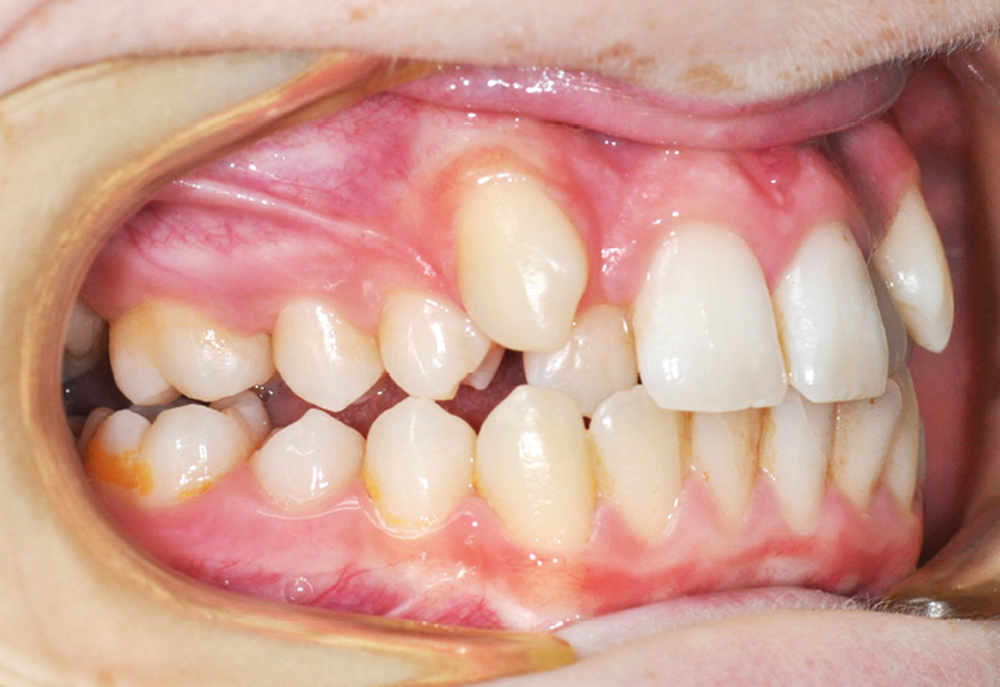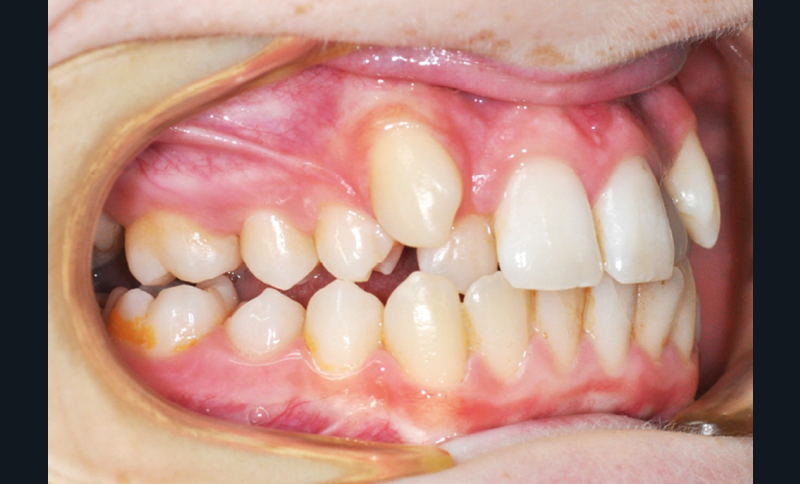 L’examen intra-oral met en évidence une occlusion inversée bilatérale ainsi qu’un manque de place conséquent pour les incisives latérales maxillaires en palato-position et une infra-vestibulo-position de 13 et 23. Le patient est déjà en denture adulte jeune, hormis la persistance de la 75. L’occlusion est en classe II, plus marquée du côté droit sans engendrer de déviation des médianes incisives, d’où une mésio-position plus importante de la 13 par rapport à la 23.