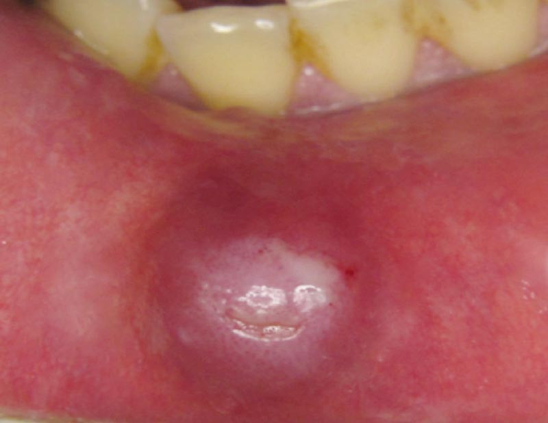 Synthèse. Ce cas est un pseudo-kyste salivaire par extravasation (mucocèle) de la lèvre inférieure. Le mucocèle est le plus souvent secondaire à un traumatisme, en général mineur. Le traumatisme entraîne la destruction partielle d’une glande qui va alors sécréter la salive dans le parenchyme environnant. À l’examen anatomopathologique, on ne retrouve pas d’épithélium bordant la cavité. Les vrais kystes salivaires rétentionnels dus à une obstruction du canal excréteur sont plus rares. L’examen anatomopathologique révèle un kyste bordé par une paroi épithéliale. Quelle que soit la forme anatomopathologique, le traitement reste l’exérèse chirurgicale. Les récidives sont exceptionnelles.